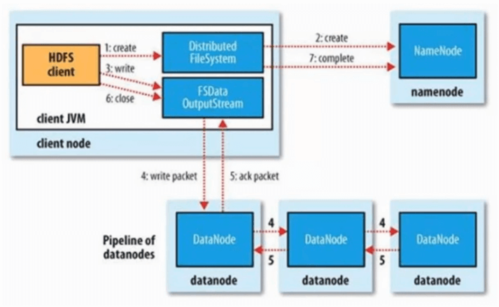 7、DataStreamer将数据块写入pipeline中的第一个数据节点,第一个数据节点将数据块发送给第二个数据节点,第二个数据节点将数据发送给第三个数据节点;