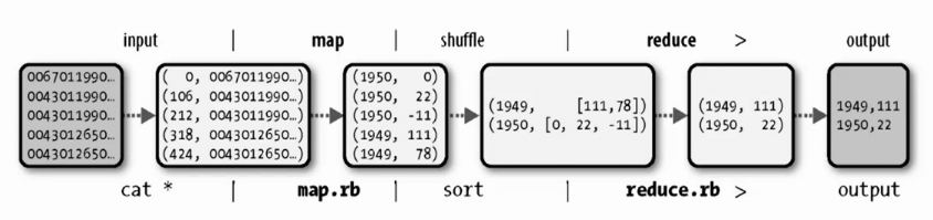 Mapreduce的map端输出作为输入传递给reduce端,并按键排序的过程称为shuffle。shuffle的字面含义是洗牌,即将map产生的数据通过分区、排序等过程分配给了不同的reduce任务。Mapreduce的数据处理流程如下图所示: