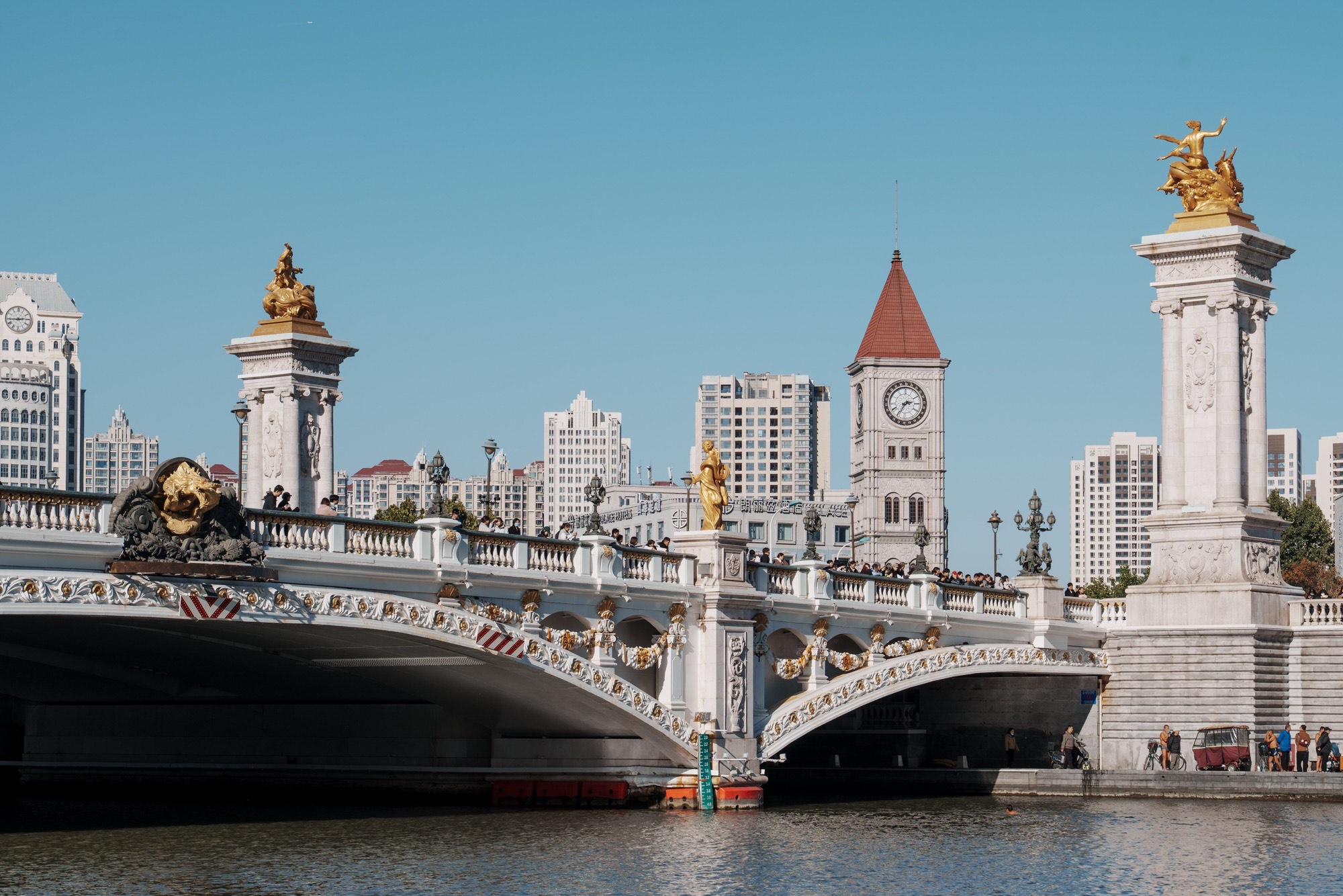 之后,再次来到海河沿岸,在北安桥观看了天津大爷跳水。北安桥的建筑风格借鉴了法国巴黎亚历山大三世桥,桥头的四座雕塑是其标志性特征。随后,乘车抵达天津之眼下方,近距离拍摄后,继续前往解放桥。