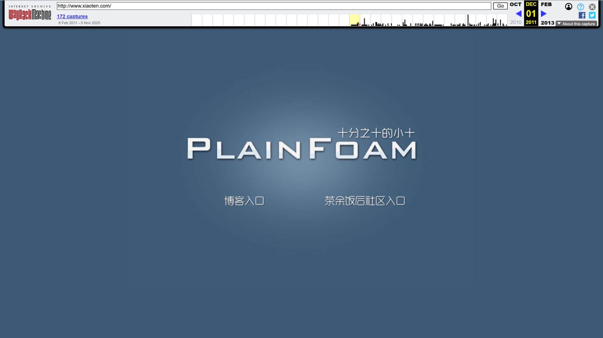 快照里留存了好几个版本的“首页引导页”。比如蓝底白字的 “PLAIN FOAM” 页面,还有写着“十分之十的小十”的蓝色大屏入口。那时候觉得,在进入博客文章列表前,先来个极简的引导页显得很“酷”,很有设计感。