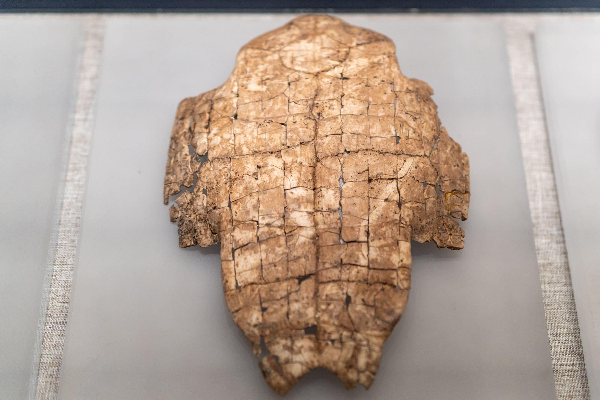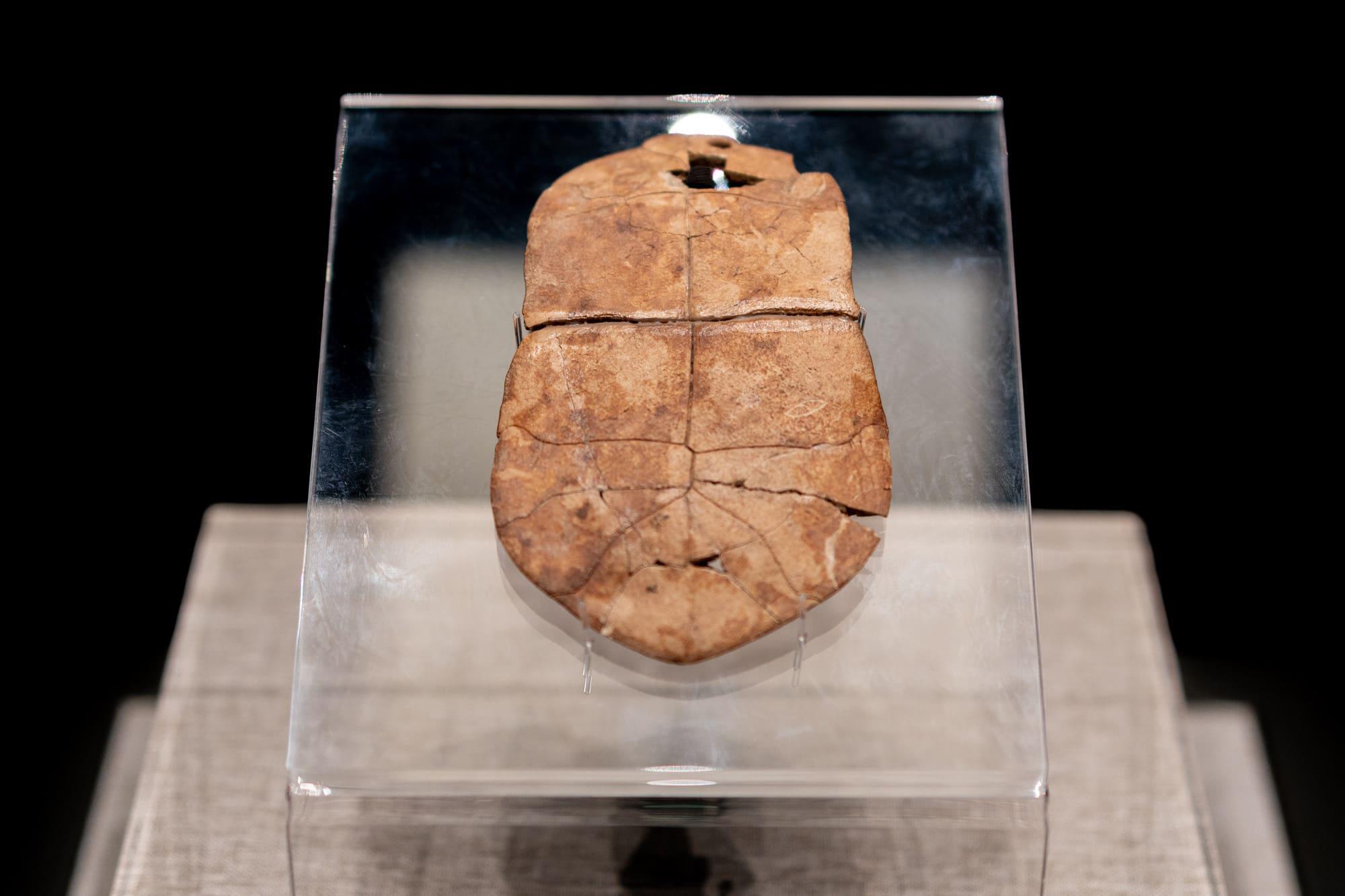 贾湖遗址刻符龟甲,新石器时代中期裴李岗文化,龟腹甲。腹甲前叶首端即喉盾位置钻1个通透的圆孔,与颈盾位置相对应,方向也是为由外向内钻。圆孔下缺失部分龟甲。腹甲后叶左腹盾下部有一个人工刻划的类似眼睛的符号,无钻、凿、灼痕迹。