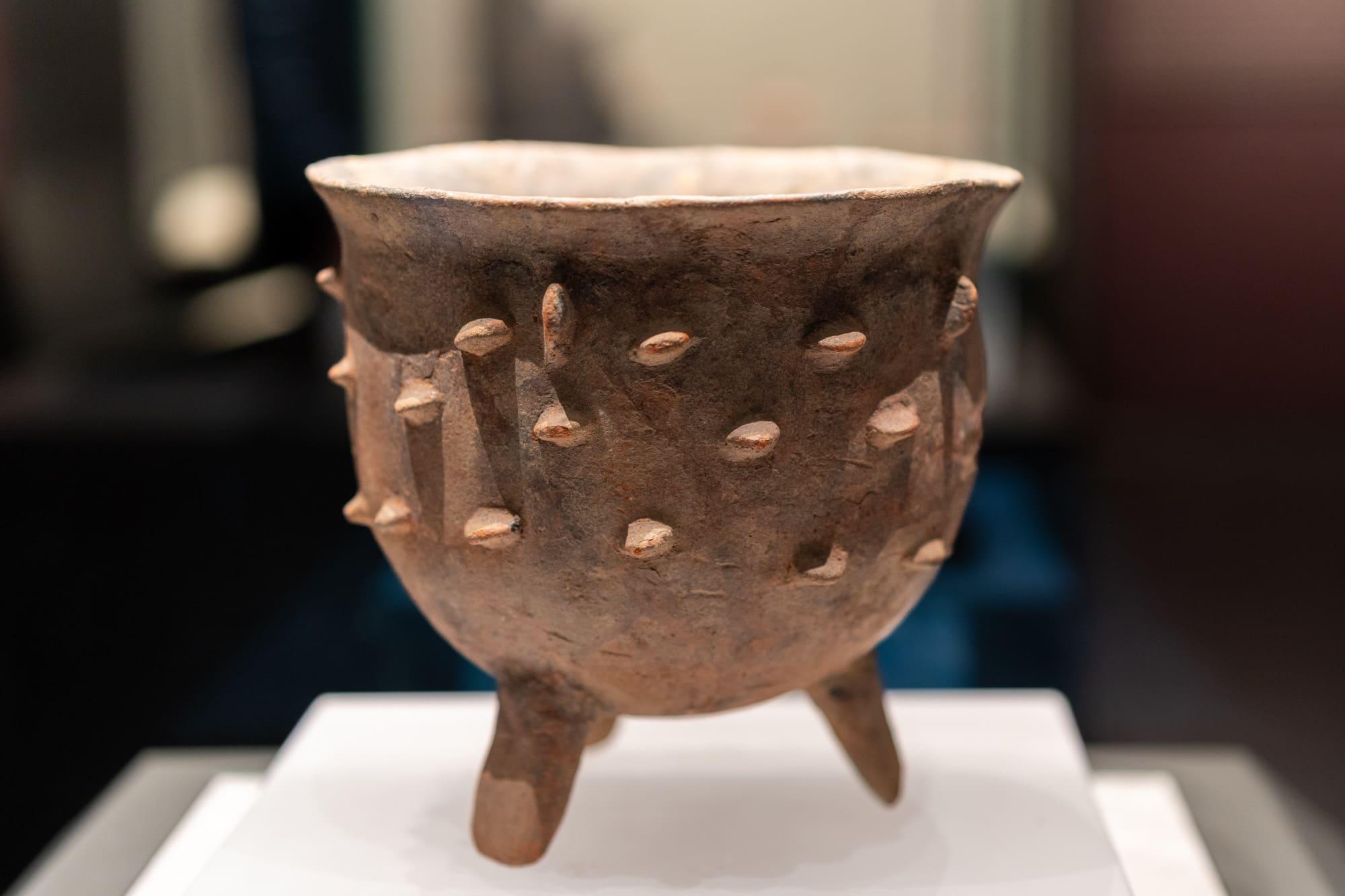 乳钉纹红陶鼎,新石器时代裴李岗文化(距今9000-7000年),1977年新郑县裴李岗出土。该器系手工捏制而成,表面乳钉既可加固器体,又可作为装饰。陶胎中有意加入粗砂粒,使其在高温下不会发生崩裂。这是目前发现的中国最古老的鼎。