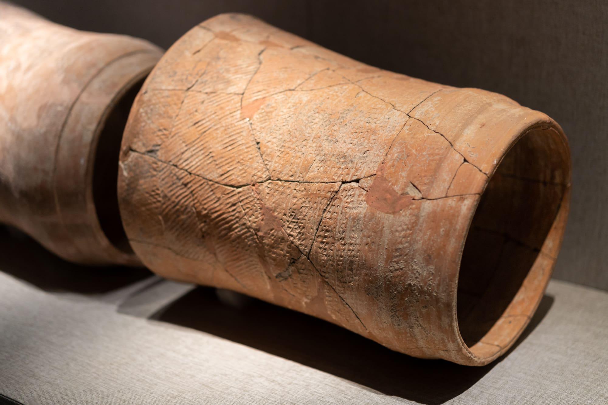 陶排水管道,新石器时代中原龙山文化(距今5000-4000年),1980年淮阳县平粮台出土。在平粮台古城南门门道下的沟渠内、南城墙内外以及城内发现了多组排水管道,每节管道两端口径大小不同,节节套合,便于向城外排水。这是中国目前发现最早的排水管道。