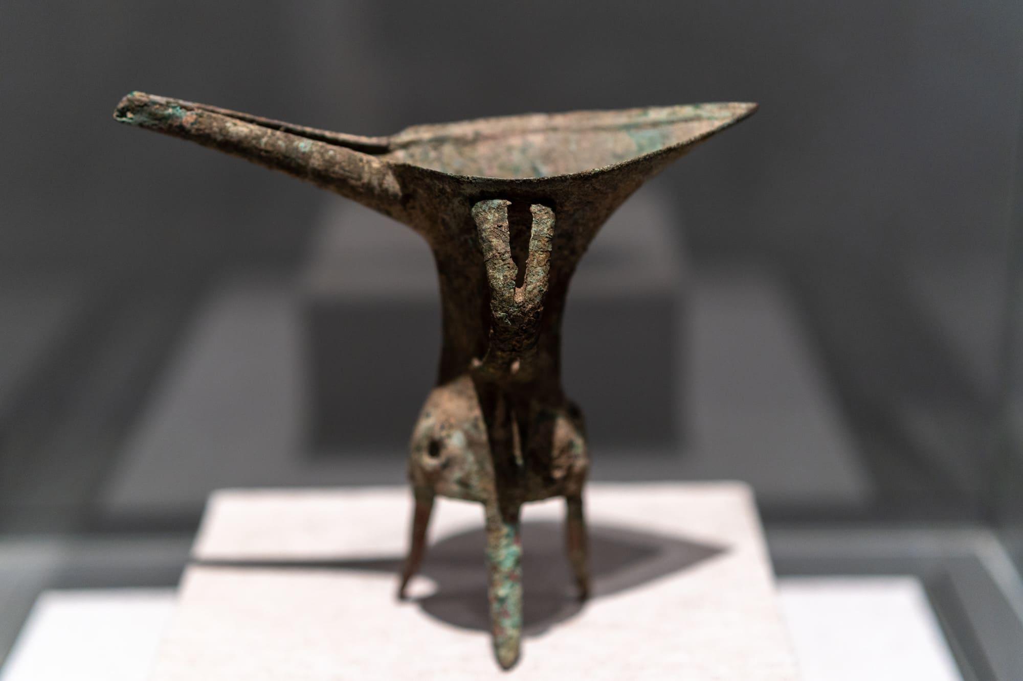 铜爵,夏代文物,高约15厘米。1975年洛阳偃师二里头遗址出土。整件铜爵棱角分明,身材修长,是时代最早、器型最美的青铜典范。
