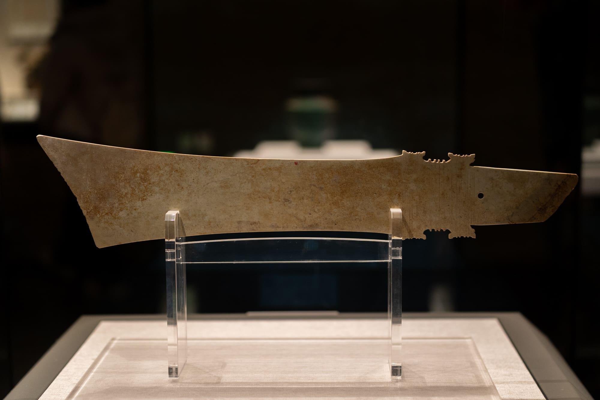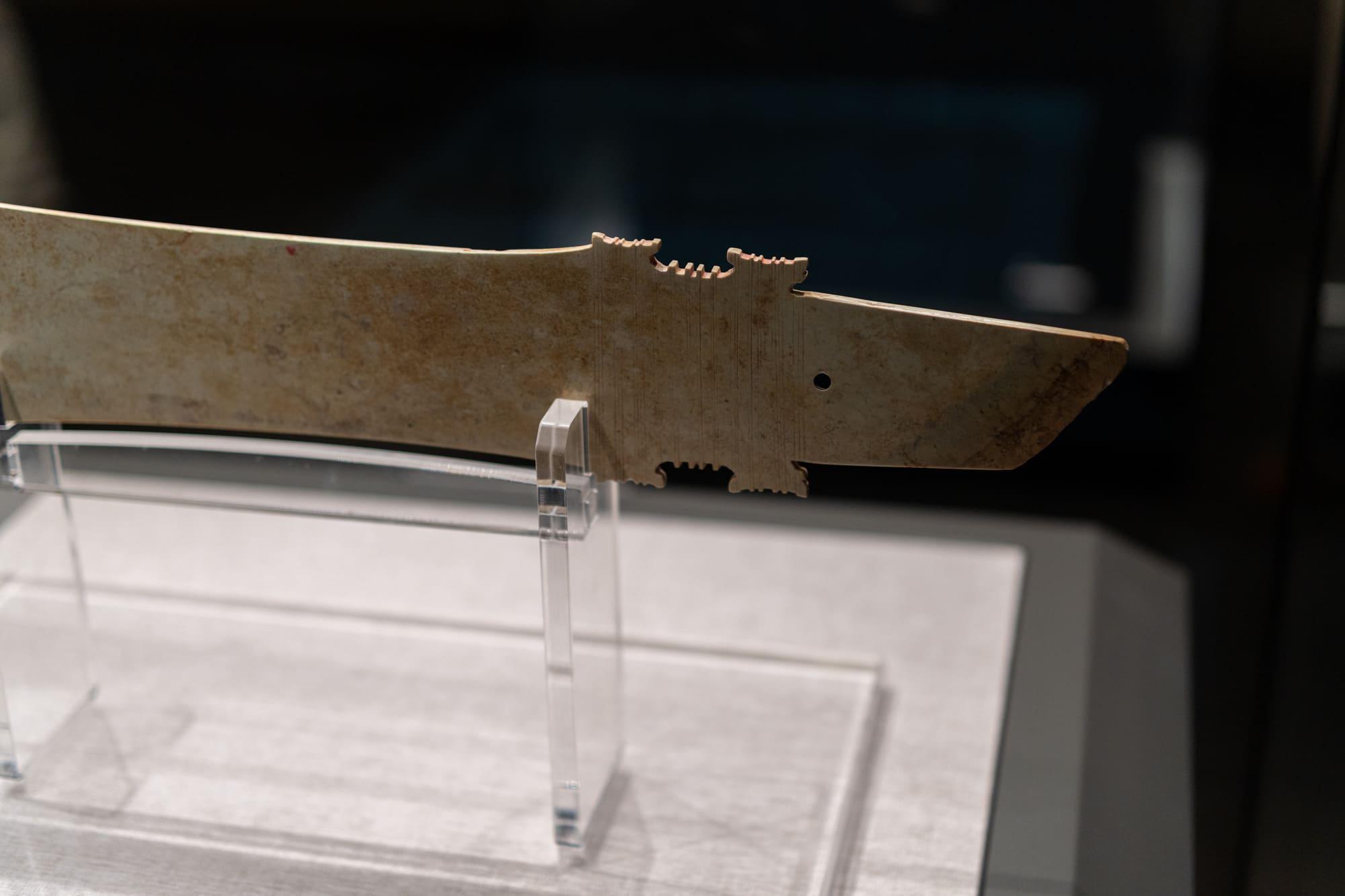 玉刀,1976 年安阳市殷墟妇好墓出土。虽为兵器造型,但其实是仪仗用玉,象征着威权。
