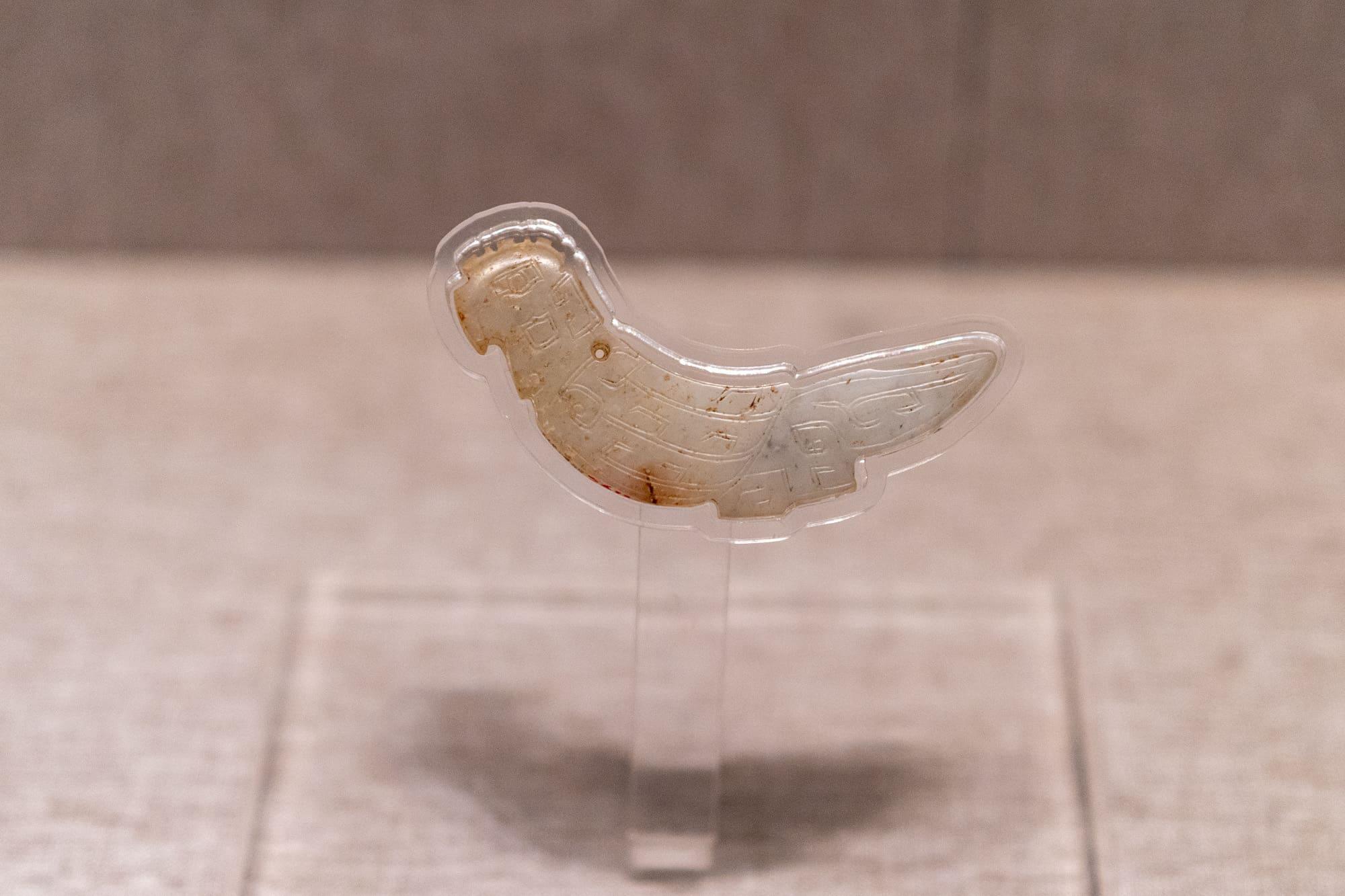 青玉鸟形配,1976 年安阳市殷墟妇好墓出土。“天命玄鸟,降而生商”,商人崇尚鸟图腾,此类玉佩在商代贵族中极为流行。