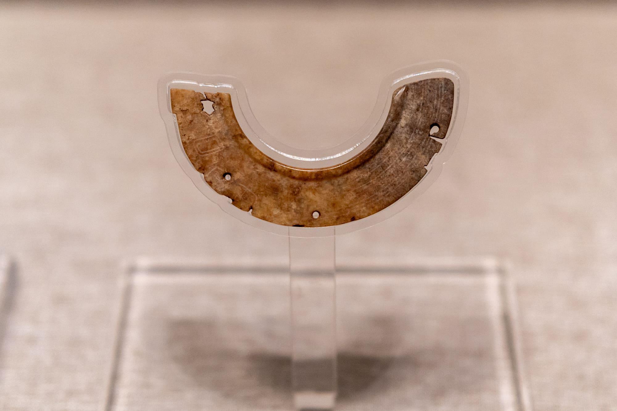 青玉龙纹璜(huáng),安阳市高楼庄出土。璜是半璧形的玉器,常作为组玉佩的组件,这件璜上雕刻有精细的龙纹。