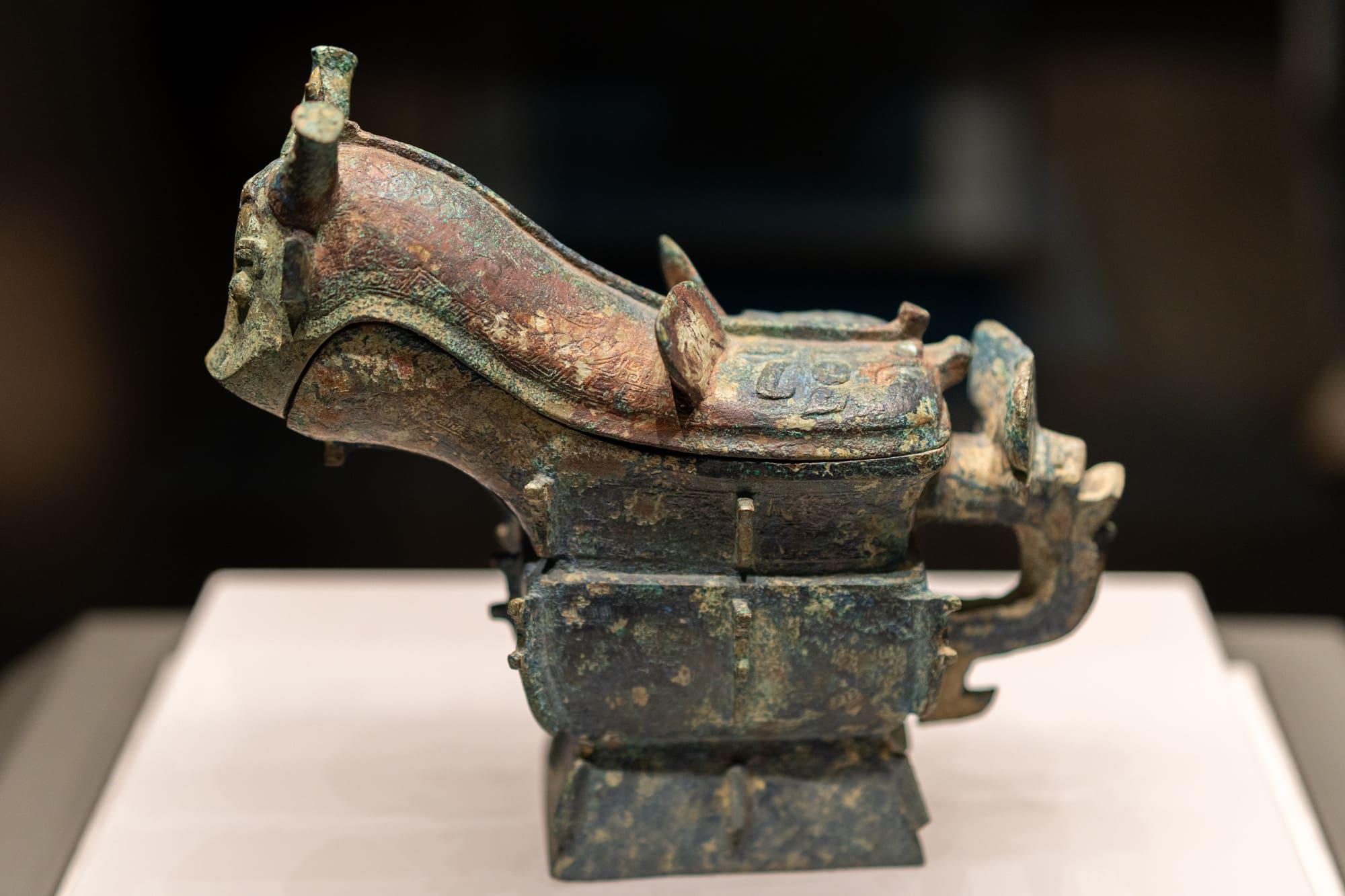 兽面纹铜方觥,造型奇特,装饰华丽,是长子口墓中出土的精品酒器。