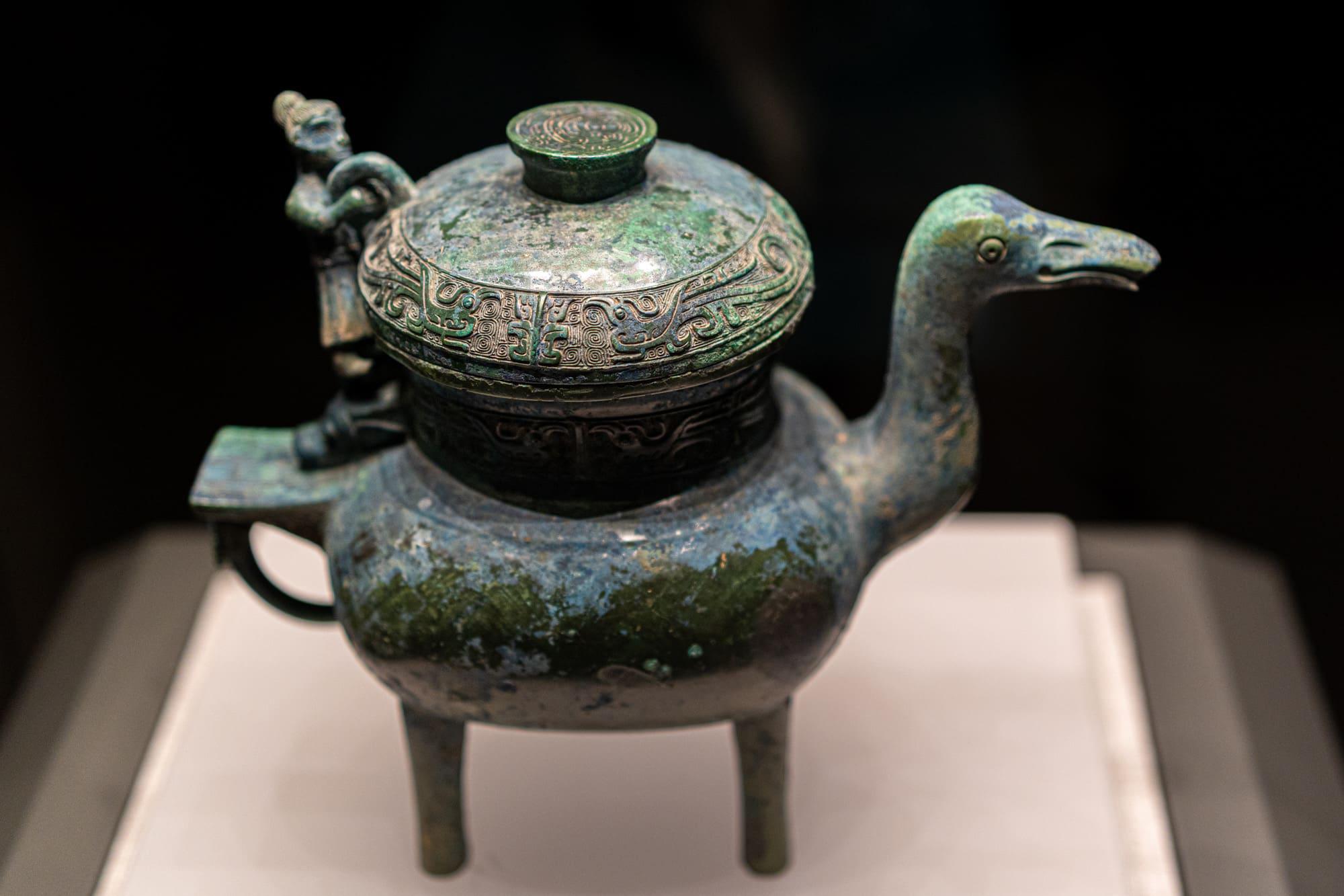 这是河南博物院的首批镇院之宝。通高117厘米,是一件巨大的青铜盛酒器。壶身为椭方形,颈部两侧装饰了两条回首观望的龙形怪兽构成双耳,腹部四周四条翼龙仿佛正在缓缓向上爬行,底部两只张口吐舌、侧首回望的卷尾兽,似乎正在倾其全力承托器身。最精彩的还是上层盖顶怒放的双层莲瓣,中央伫立一只引颈欲鸣、展翅欲飞的仙鹤,被郭沫若先生誉为“时代精神之象征”。