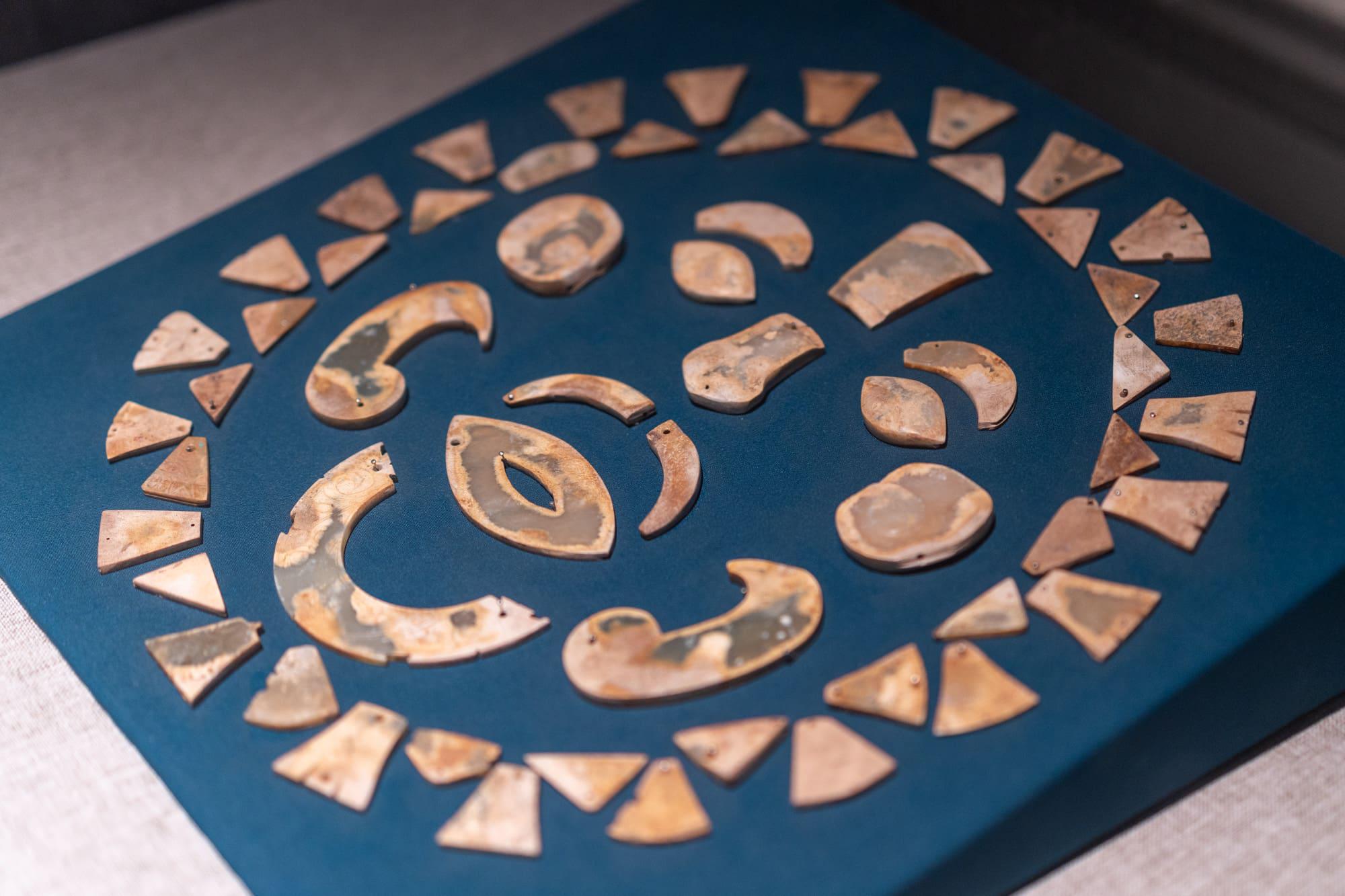 缀玉面罩——金缕玉衣的雏形,三门峡虢国墓地出土。缀玉面罩,又称“幎目”“面巾”,是在死者面部覆盖的缀有玉石片的绢帛面幕,为古代贵族墓葬中常见的葬玉。