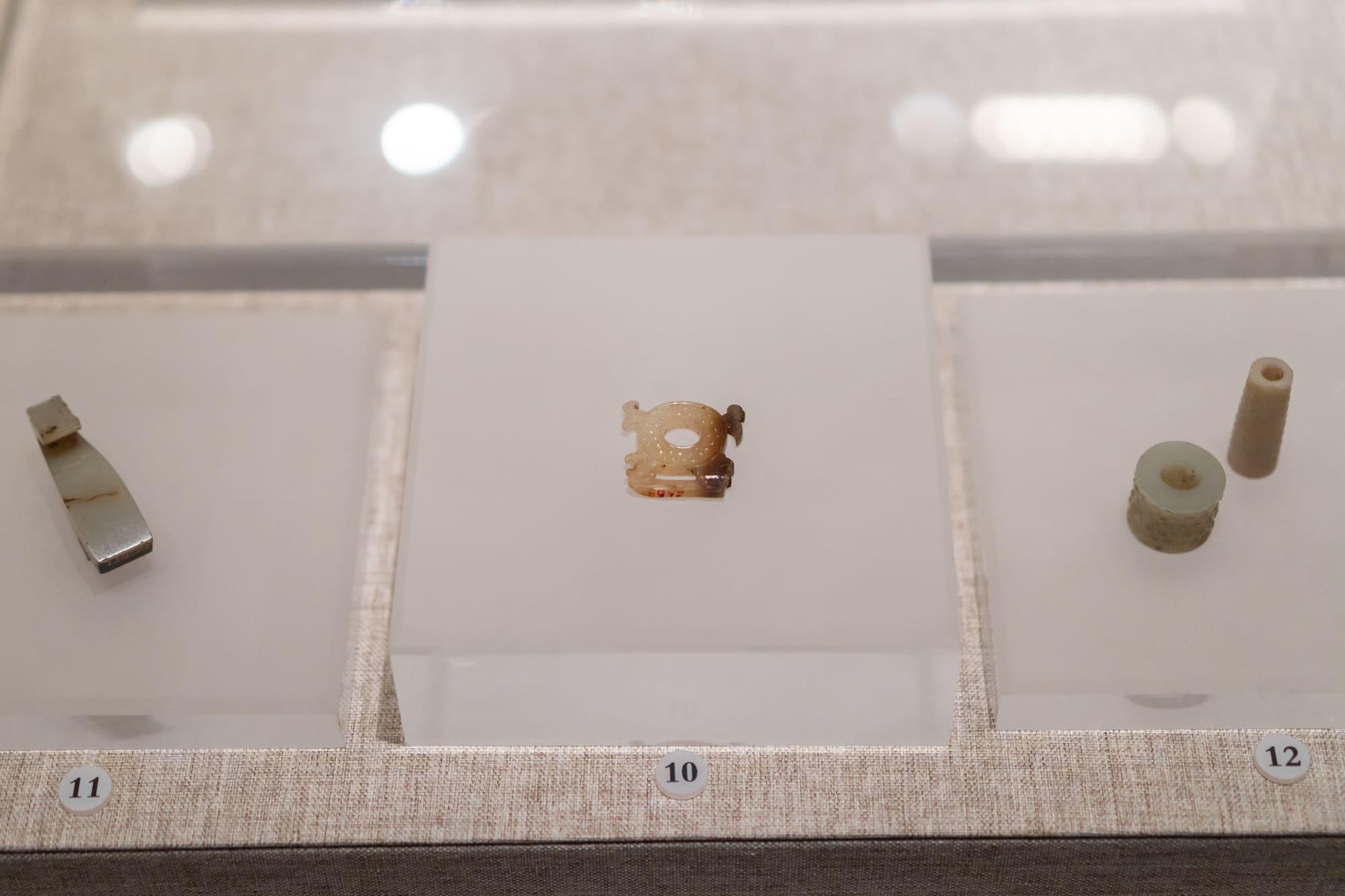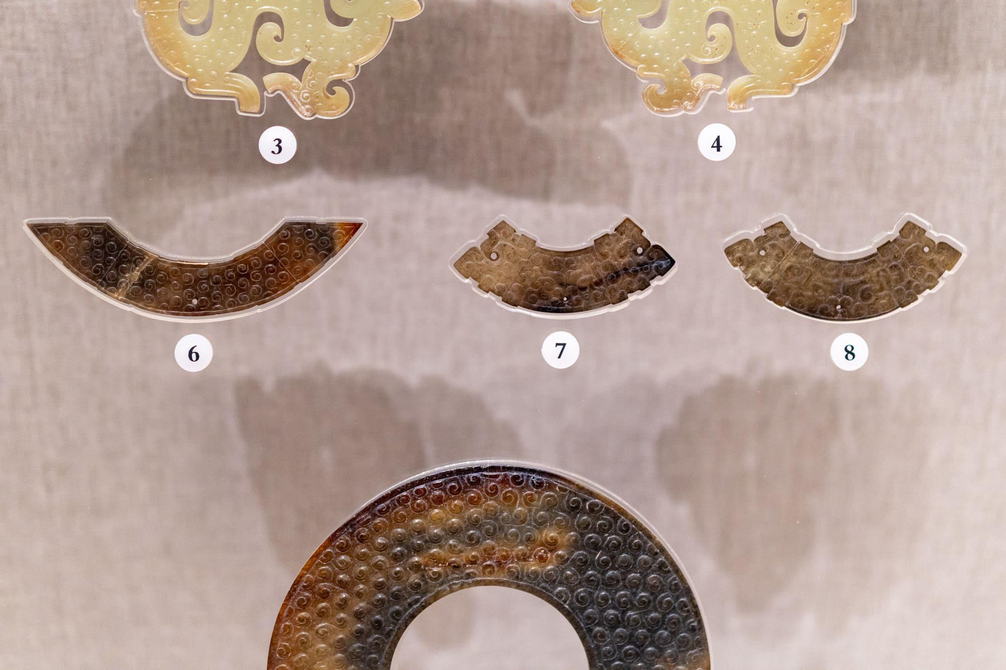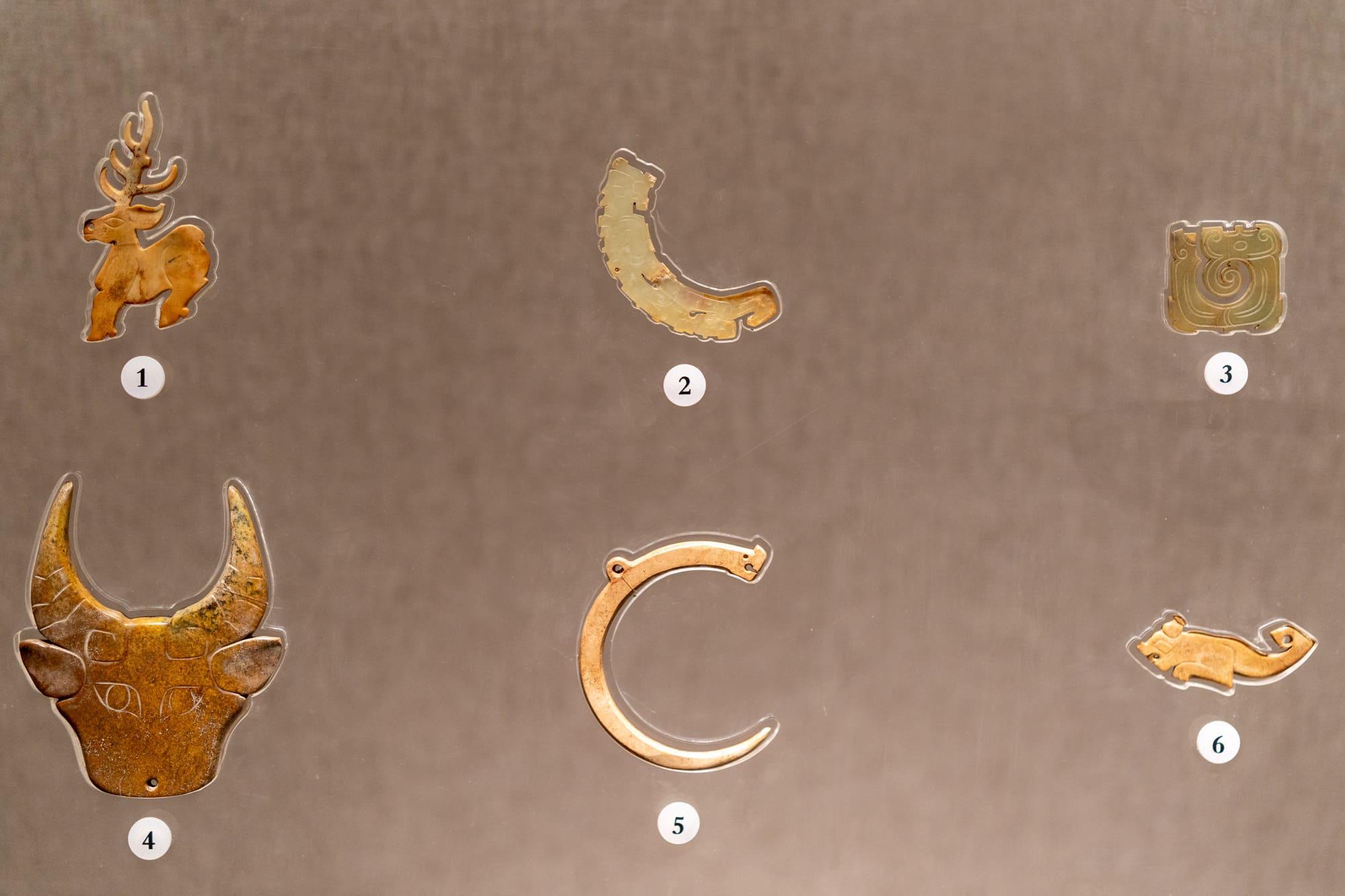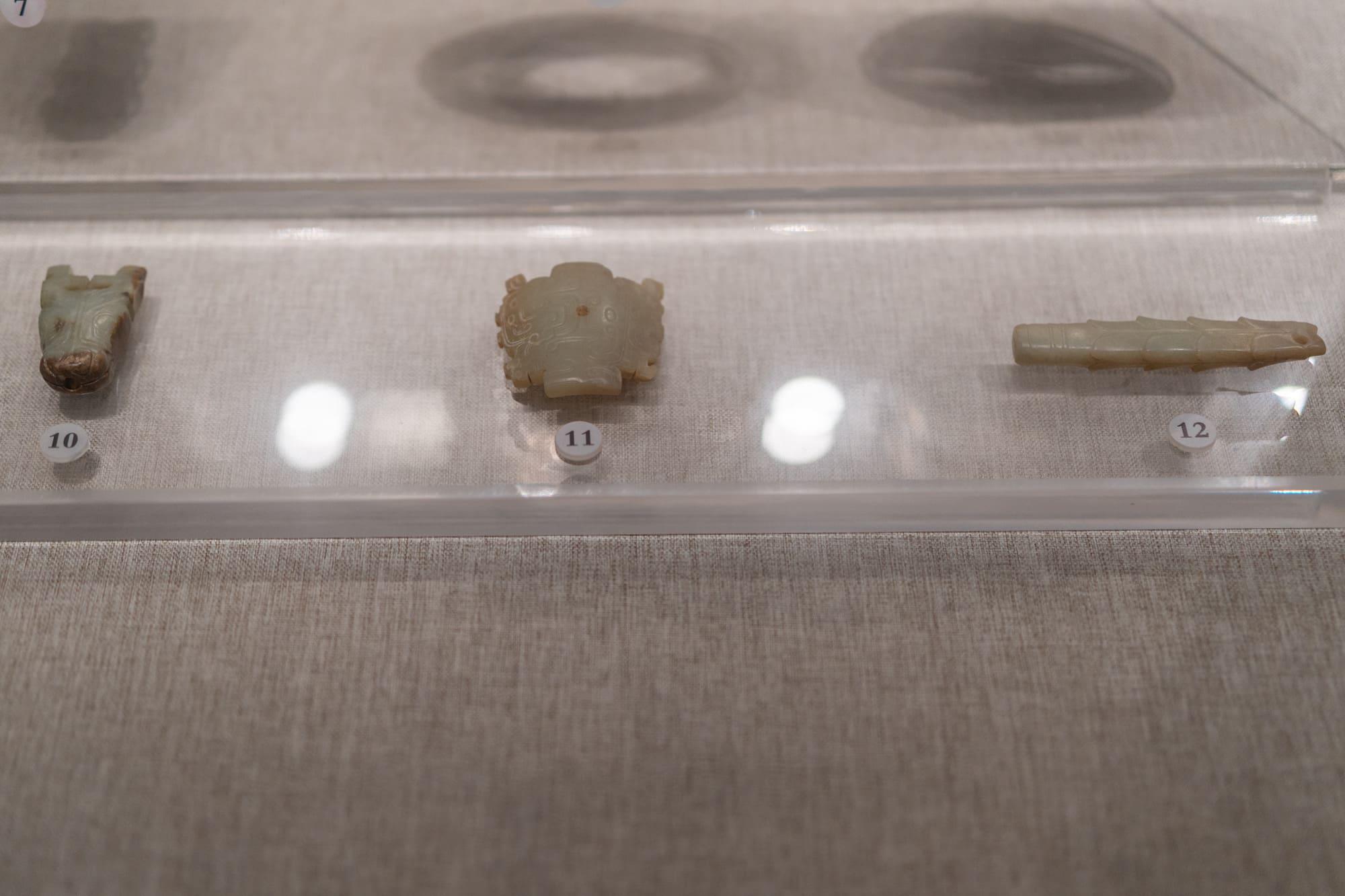 ① 青玉鹿形佩、② 人龙合纹璜、③ 盘龙形佩、④ 玉牛首、⑤ 龙形觹(xī)、⑥ 青玉龙形佩、⑦ 青玉龙凤纹佩、⑧ 玉璧、⑨ 玉戚、⑩ 玉马首、⑪ 青玉兽面形人龙佩 、⑫ 青玉鱼柄形饰