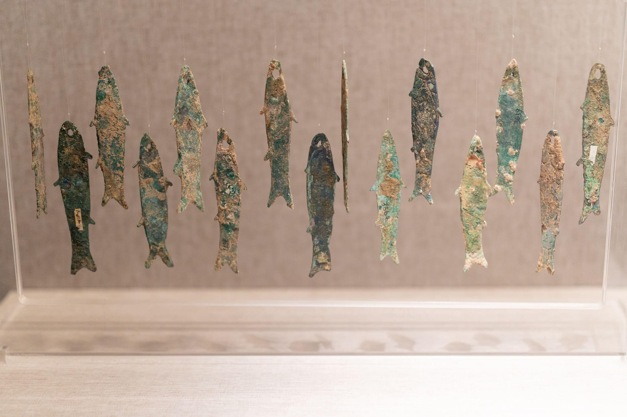 棺饰铜鱼,三门峡虢国墓地出土。在周代高级贵族的棺椁之间,常撒有大量的铜鱼、玉鱼或石鱼,正如《礼记》记载的“鱼跃扶池”,寓意死者灵魂的自由与繁衍。