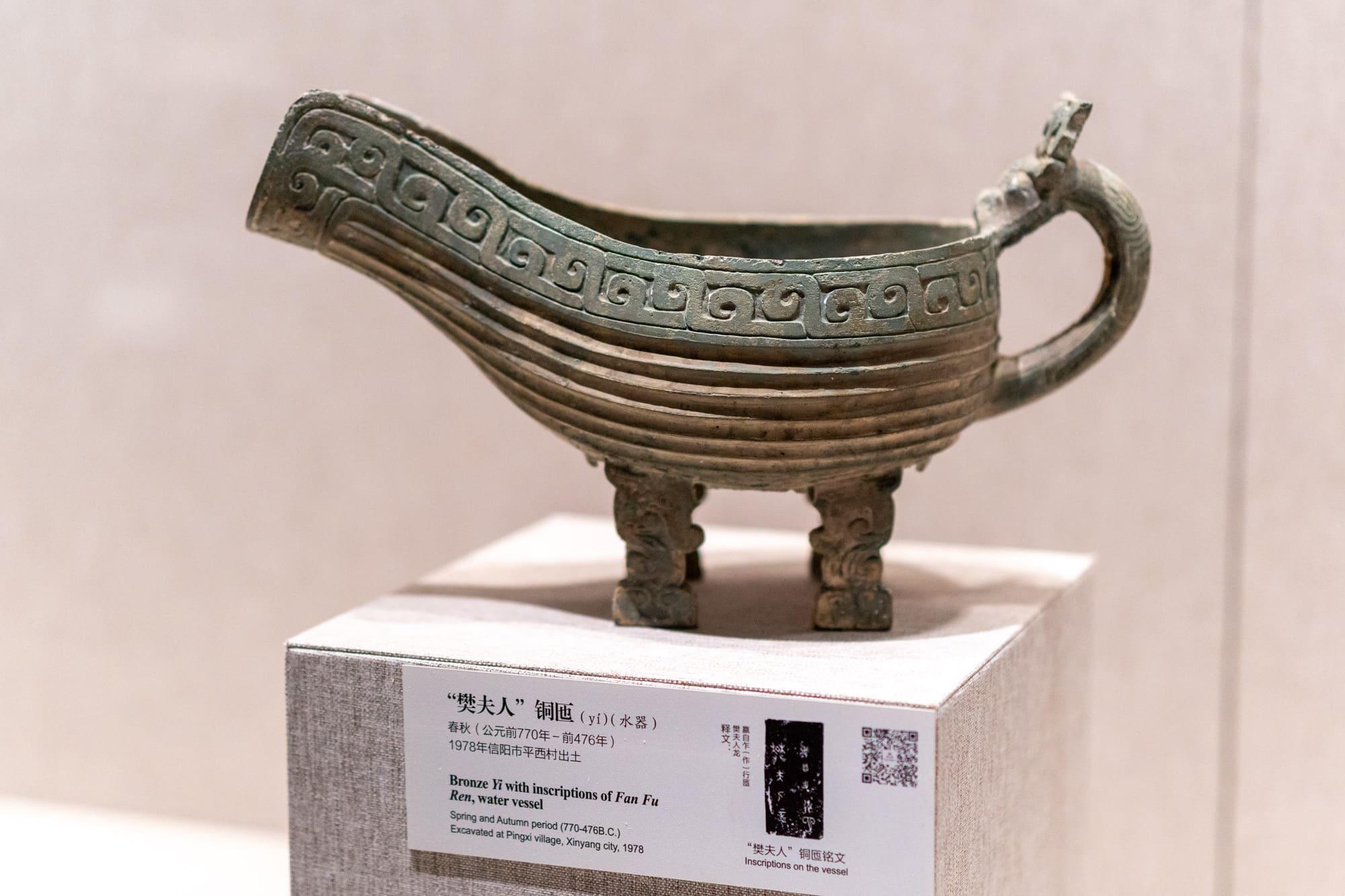 “樊夫人”铜匜(yí),春秋(公元前 770 年 - 前 476 年),1978 年信阳市平西村出土。铜匜前部有宽流,后有龙首状的鋬(pàn),腹部微鼓,下有四条扁状鸟形足。