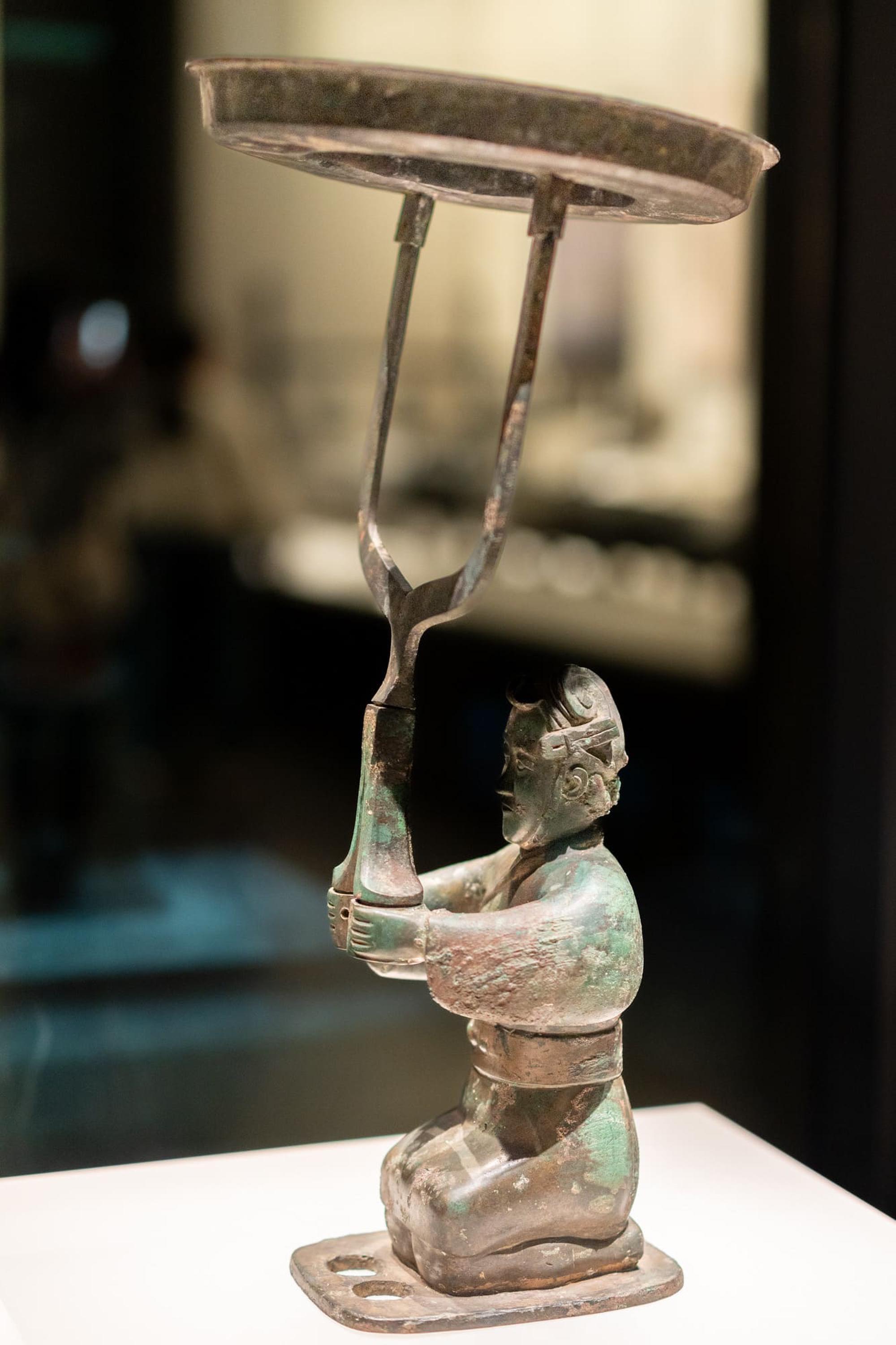 跽(jì)坐人漆绘铜灯,战国中晚期,通高48.9、灯盘径23.7厘米,重7.5千克。1975年河南省三门峡上村岭出土。