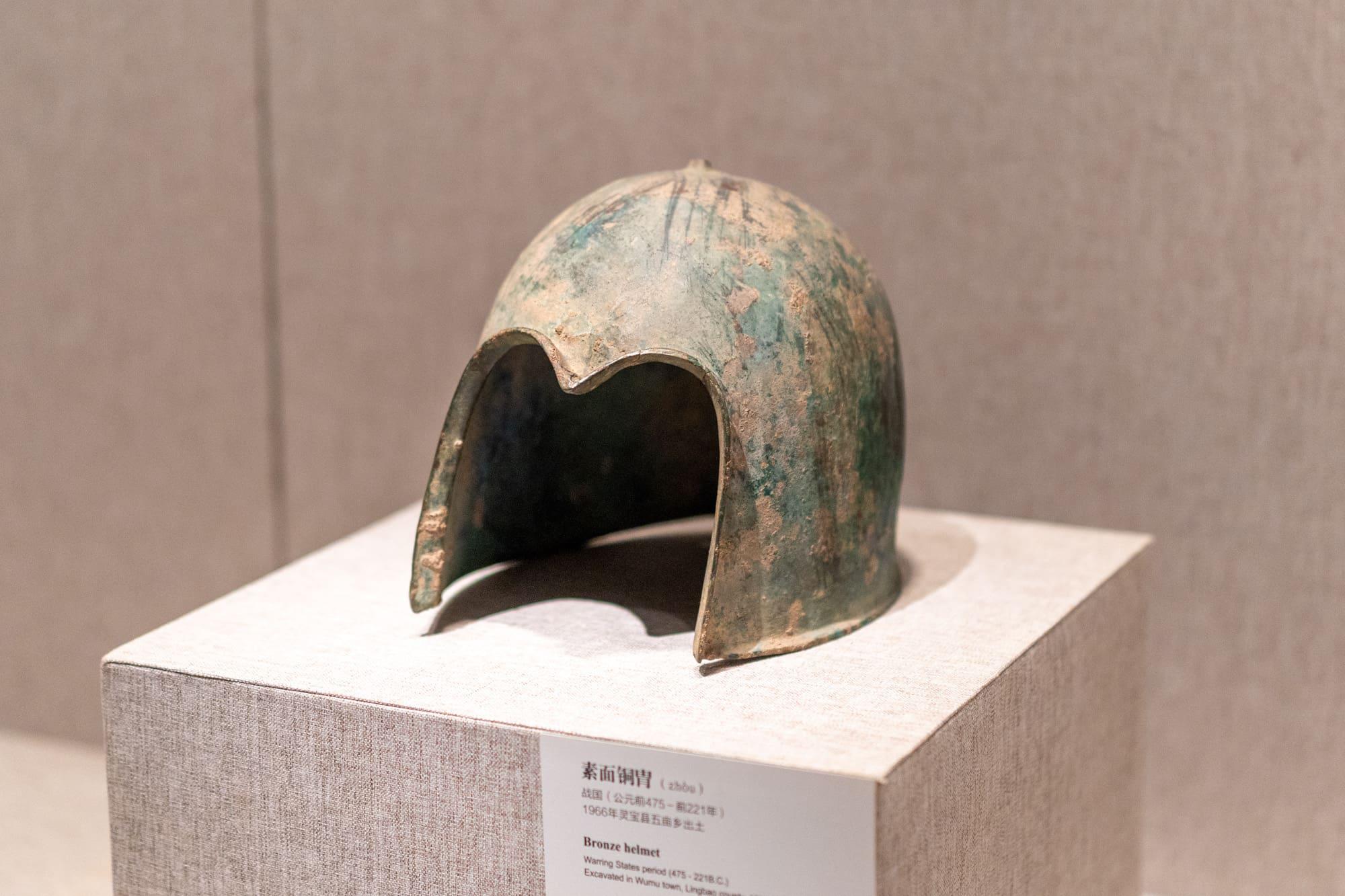 素面铜胄(zhòu),战国,灵宝出土。即古代的头盔,用来保护头部。