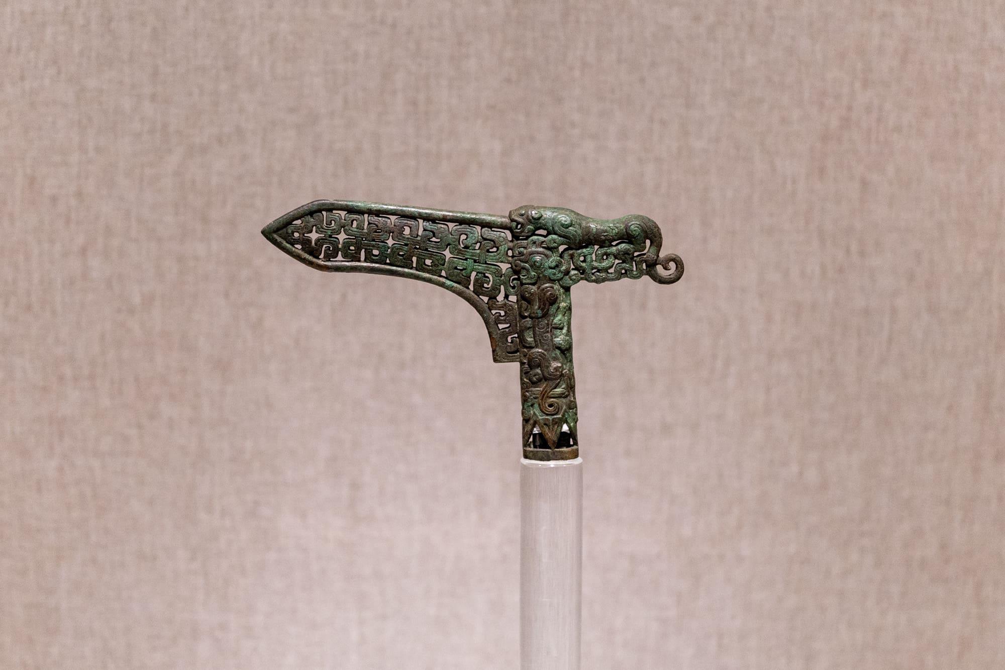 钺(yuè)在古代不仅是兵器,更是王权和军事指挥权的象征(类似尚方宝剑)。这件铜钺呈斧形,钺身透雕夔龙纹,工艺精湛,显然不是用于实战,而是作为仪仗器使用。