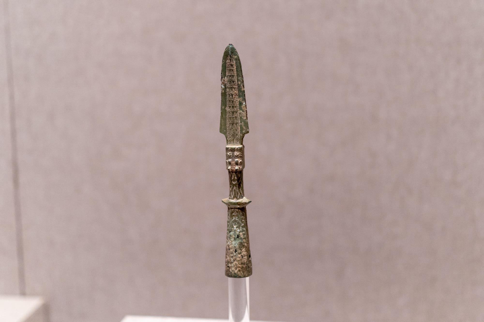卷首铜刀,刀尖卷起,造型独特,既可能是实用工具,也可能是祭祀用品。