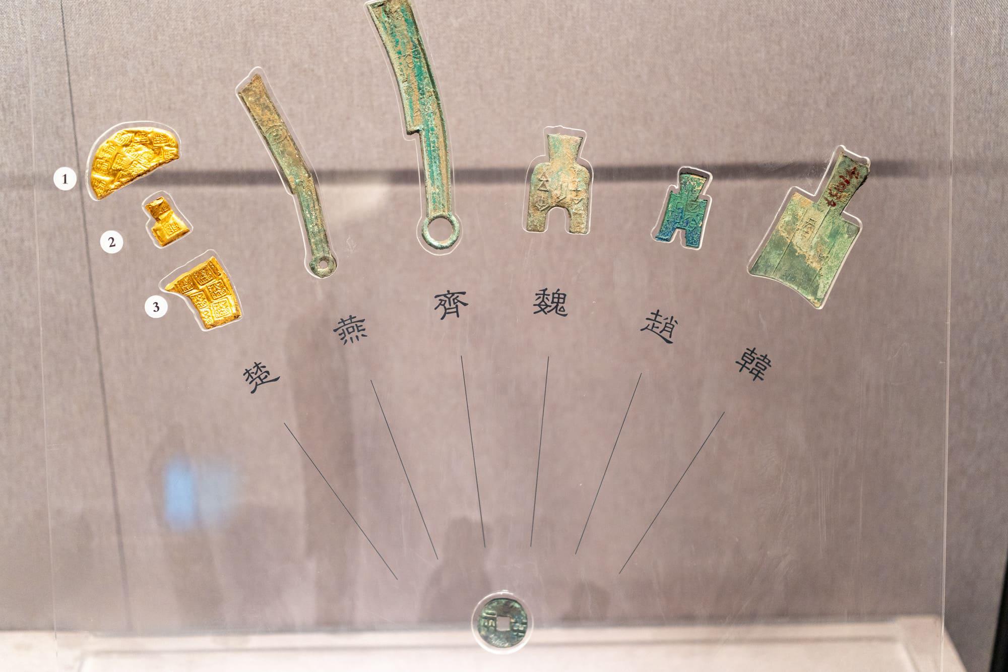 各国钱币:展示了从战国纷乱的货币体系到秦始皇统一货币的演变。