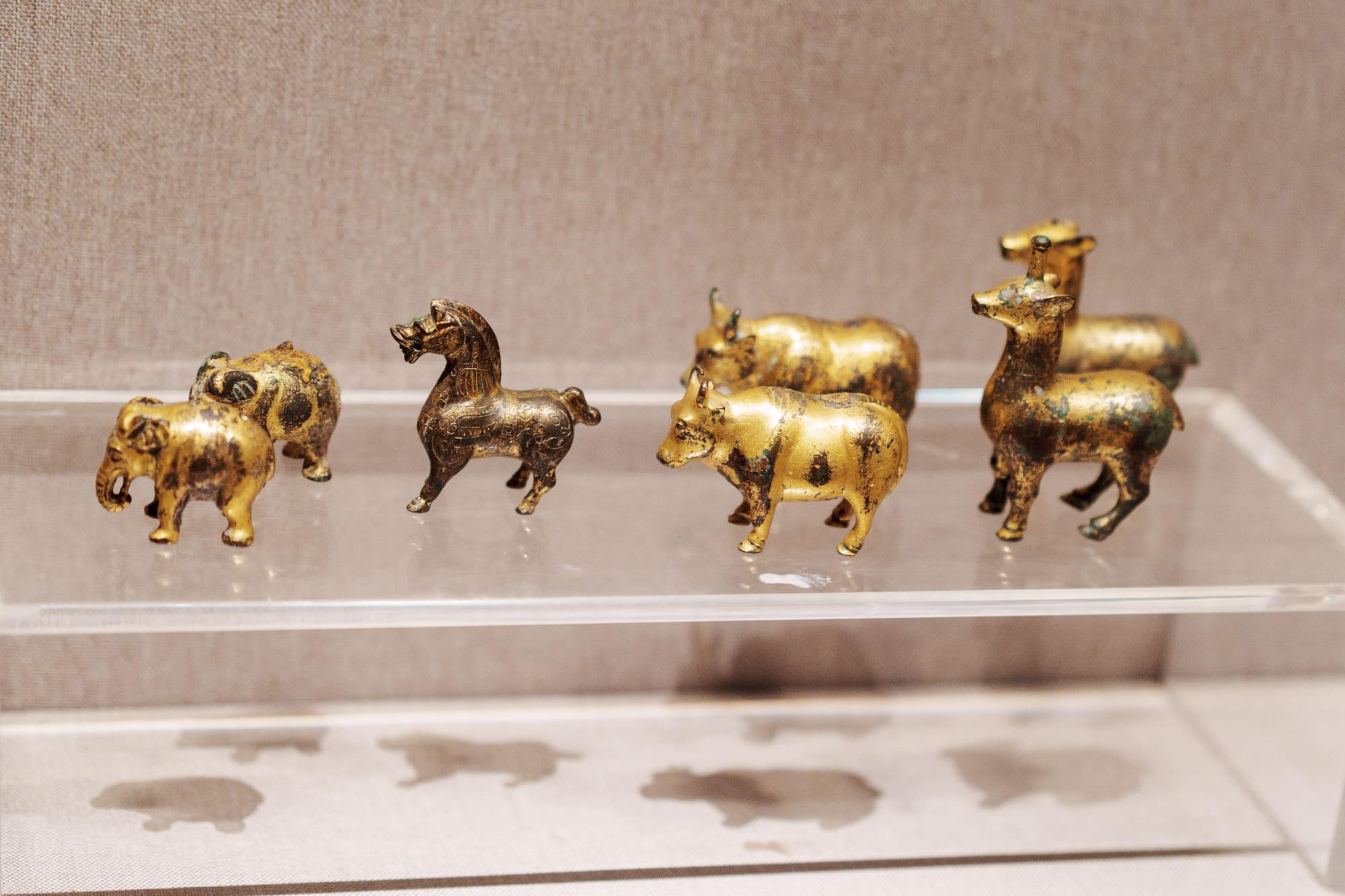 包括鎏金铜象、铜马、铜牛和铜麒麟。这些动物造型写实与想象结合,通体鎏金,金光闪闪,显示了东汉时期高超的青铜铸造与鎏金工艺。