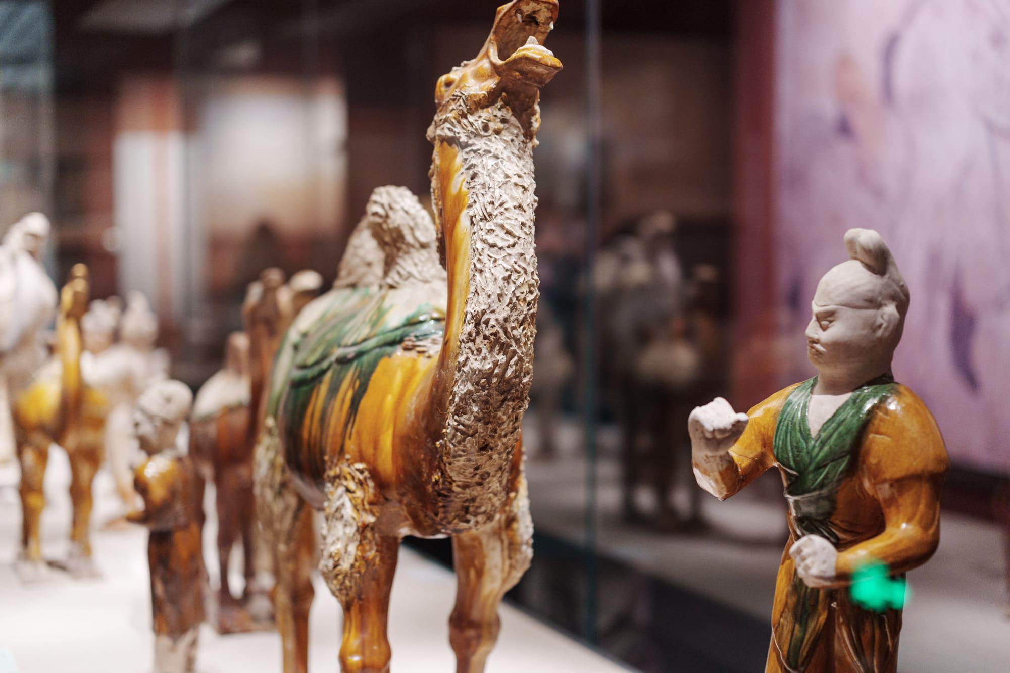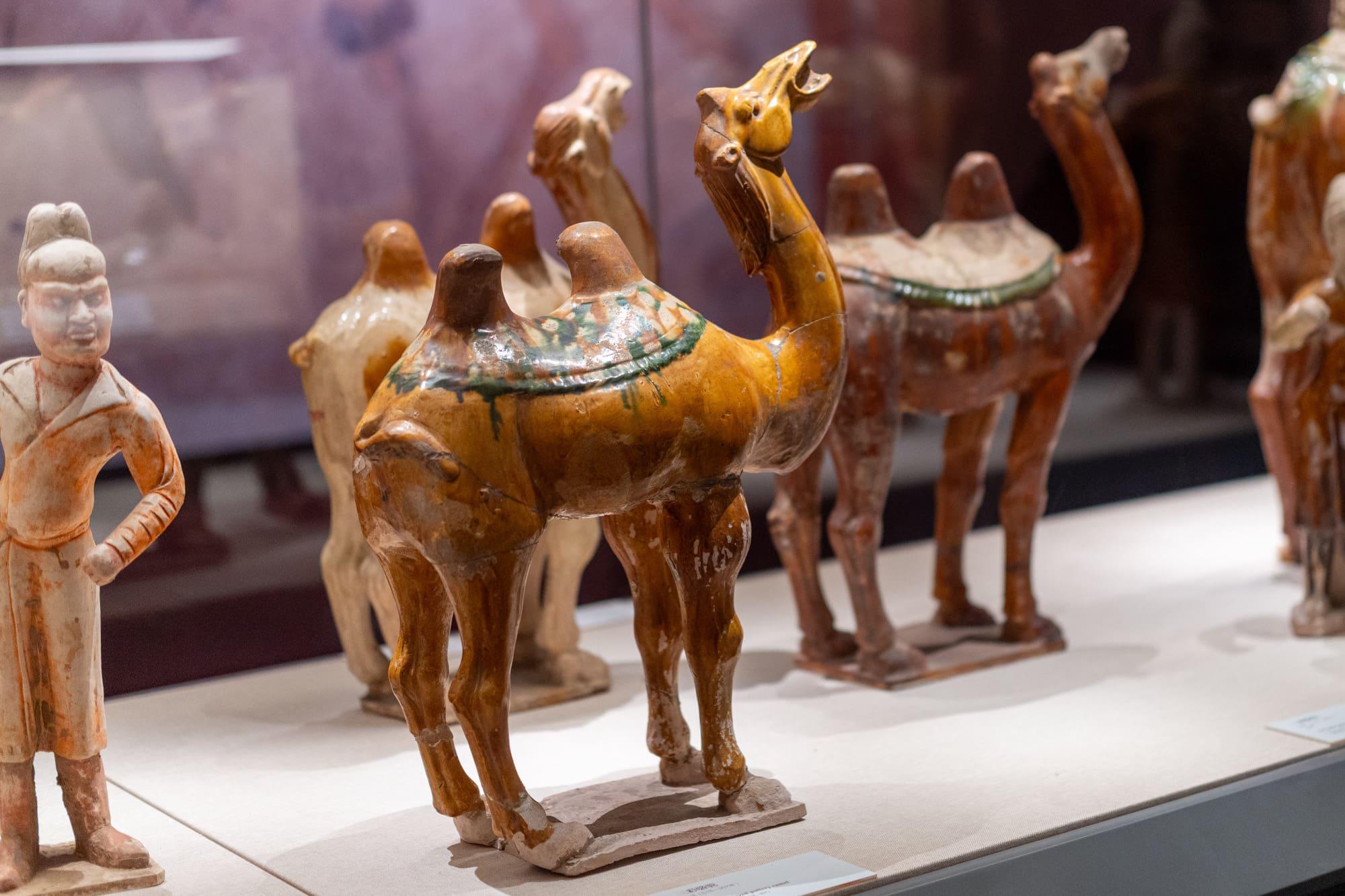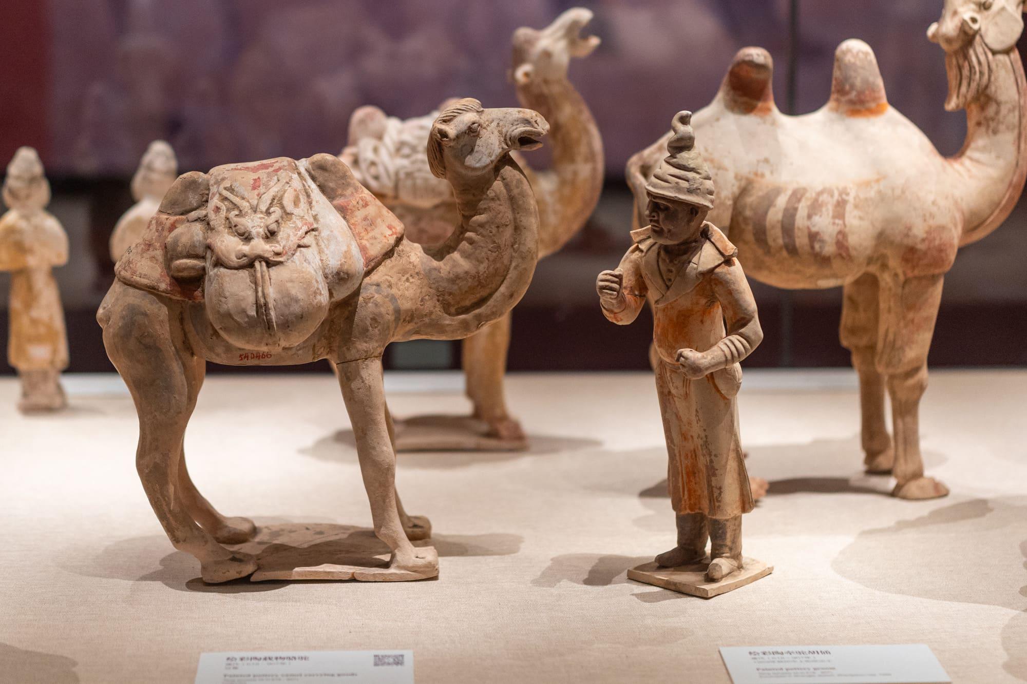 骆驼是丝绸之路上主要的交通工具。这件三彩骆驼昂首挺立,驼背上驮着丝绸等货物。牵驼人为胡人形象,深目高鼻,身穿胡服,生动再现了西域商人在中原经商的场景。