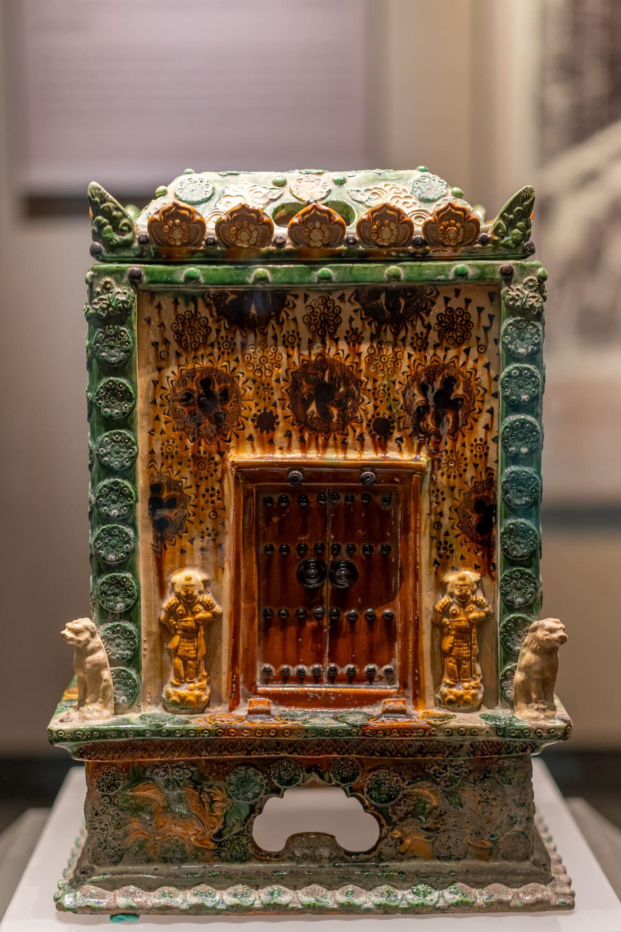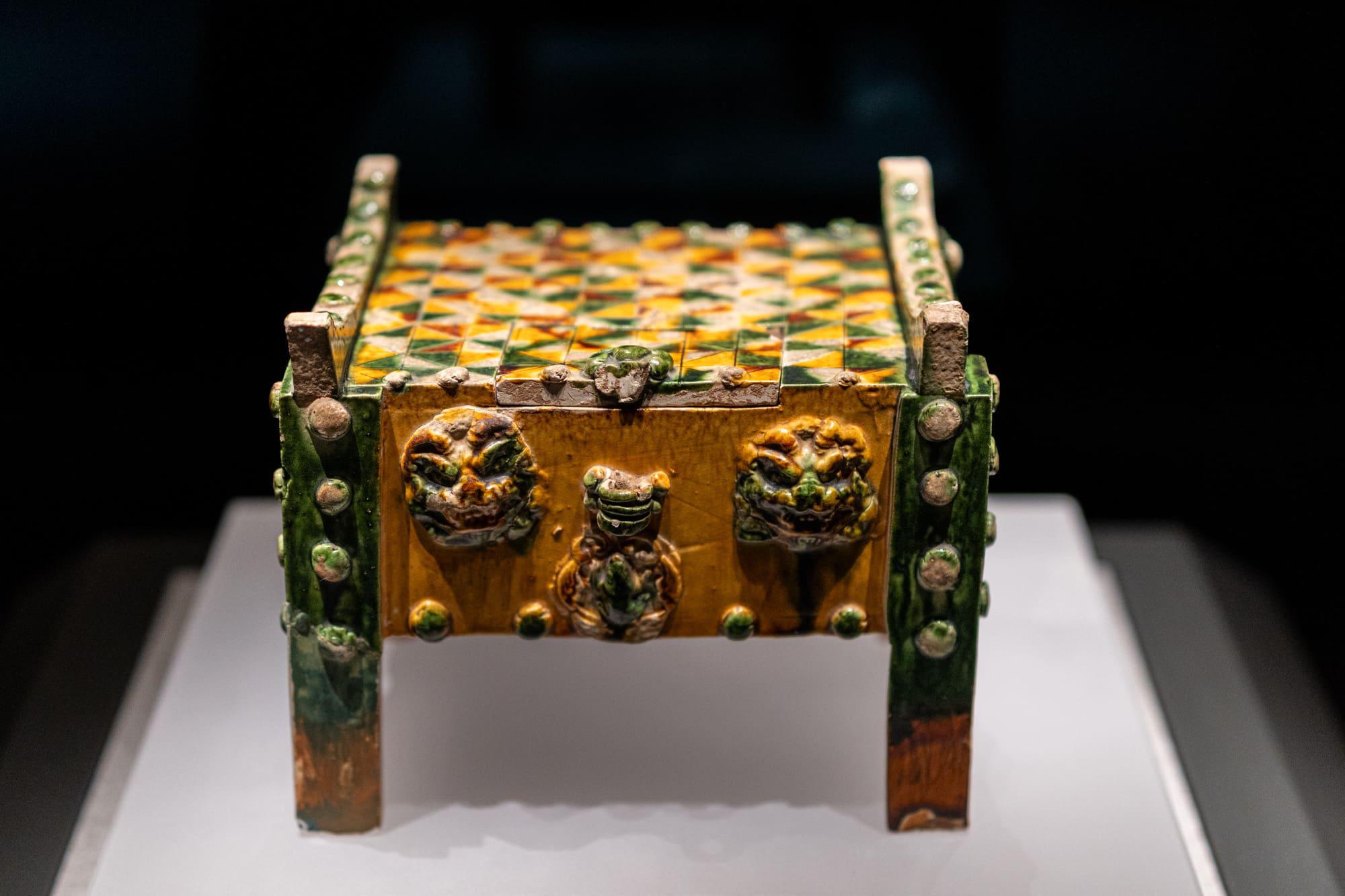 三彩舍利匣:四壁塑天王、蹲狮,施低温釉。