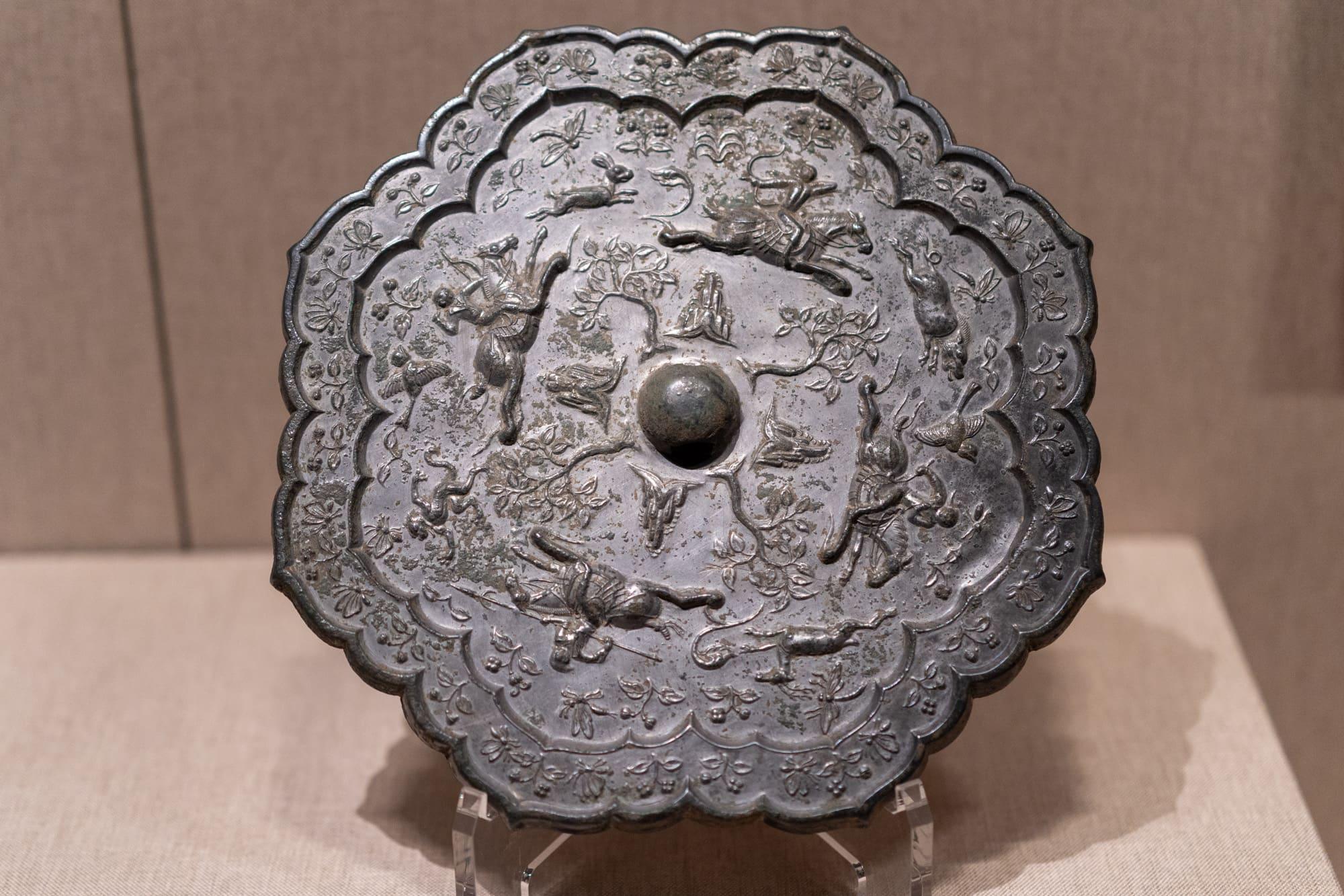 骑马狩猎纹铜镜:唐代,扶沟出土。镜背饰四座山峰和四棵大树,四个骑士或张弓或持矛追逐虎、兔、猪、鹿,场面紧张激烈。