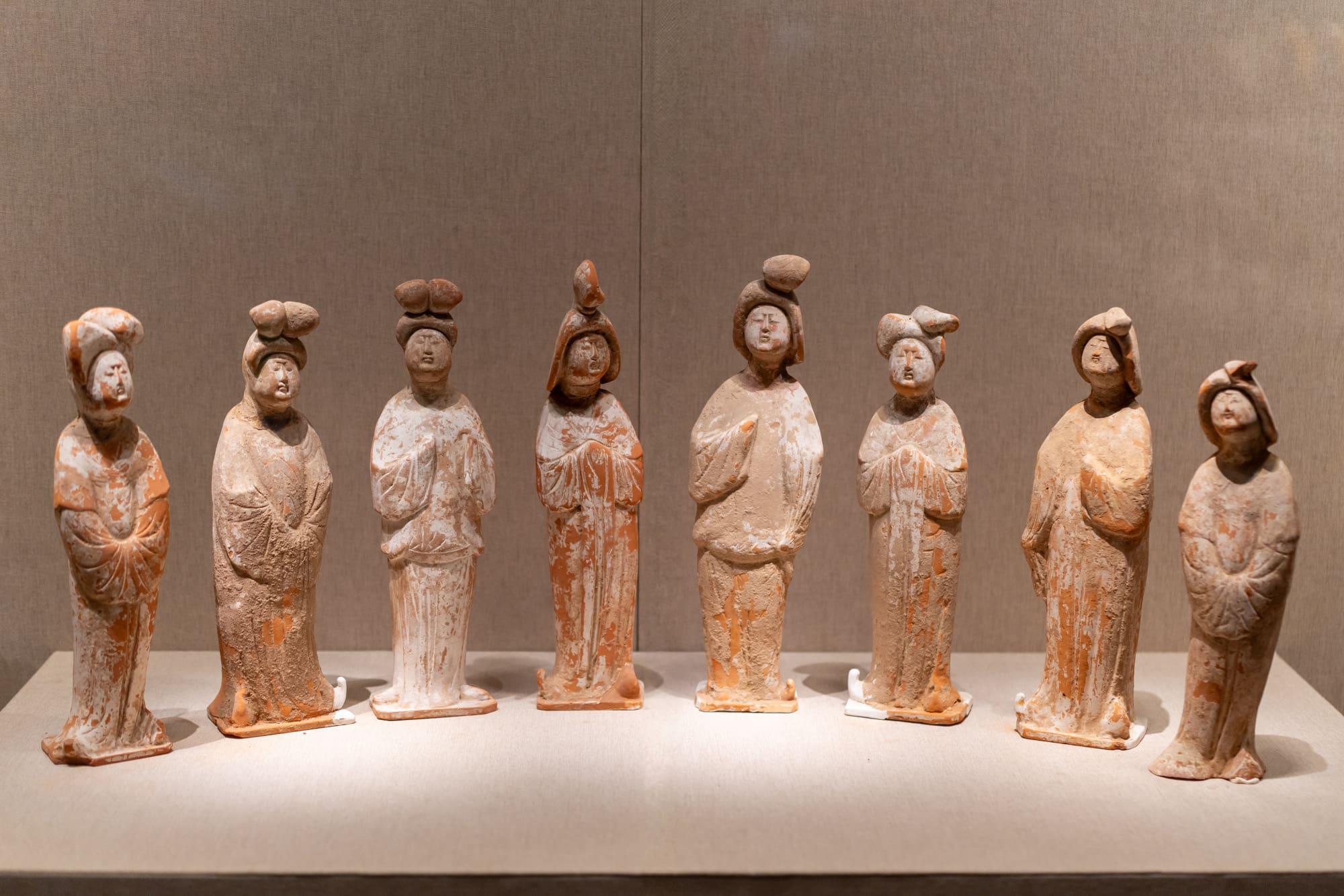 陶俑系列:包括三彩文官俑、三彩铠甲武士俑、红陶女俑、绘彩陶披帛女俑等,真实反映了气度雍容的唐人生活与服饰特色。