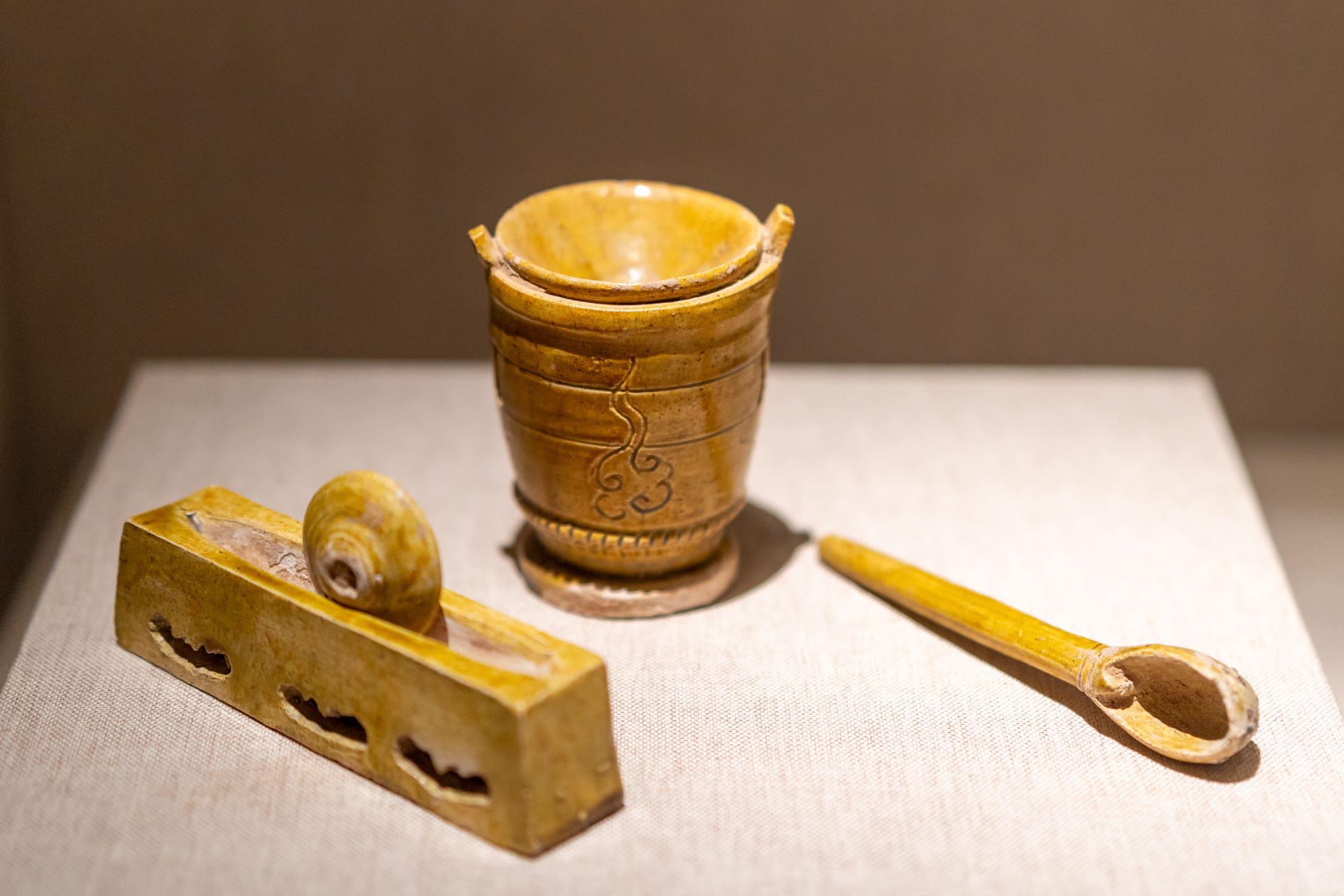 黄釉陶碾、陶炉、陶勺:唐代。展示了唐代的茶文化与生活细节。