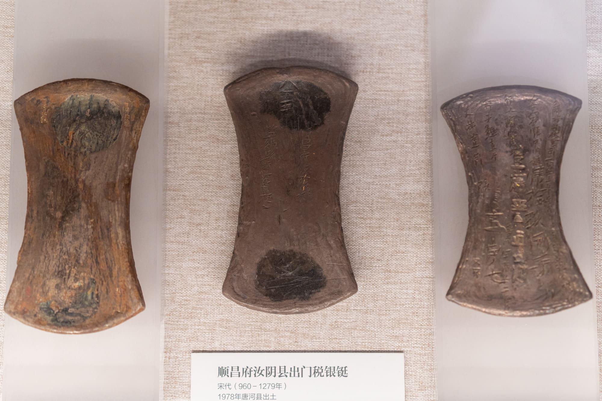 聂北铺出门税银铤(左):北宋,确山出土。刻有“出门税”字样,是研究宋代商税的重要实物。