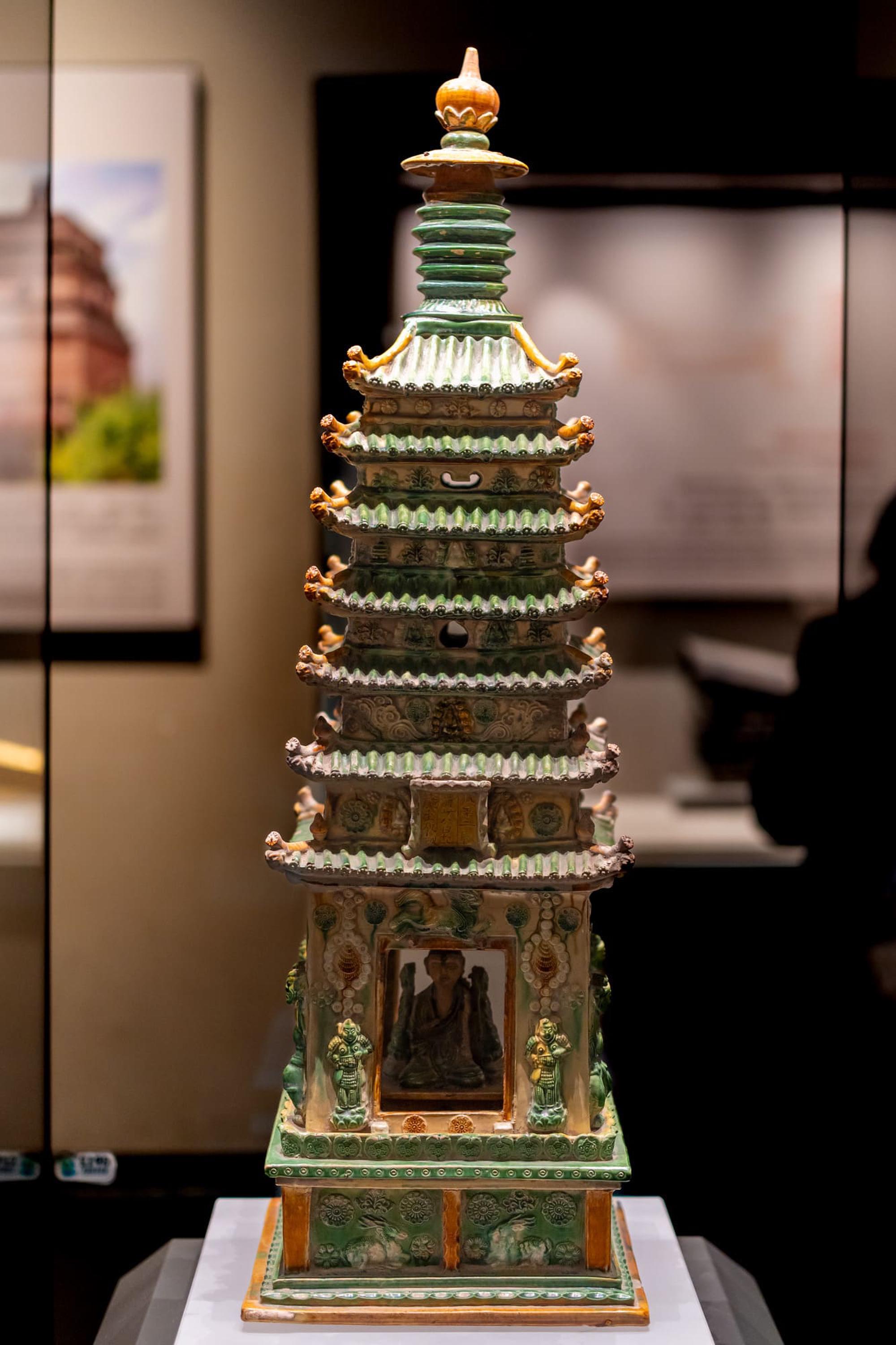 第八展厅:唐代经济繁荣,文化生活异彩纷呈。巩义黄冶窑烧制的唐三彩集中体现了盛唐物质文化的富丽堂皇。河南地区是隋唐时期道教和佛教的传播中⼼,留存了⼤量的佛塔、⽯碑、⽯刻造像等遗迹遗物,反映了隋唐宗教⽂化的兼容并蓄。
