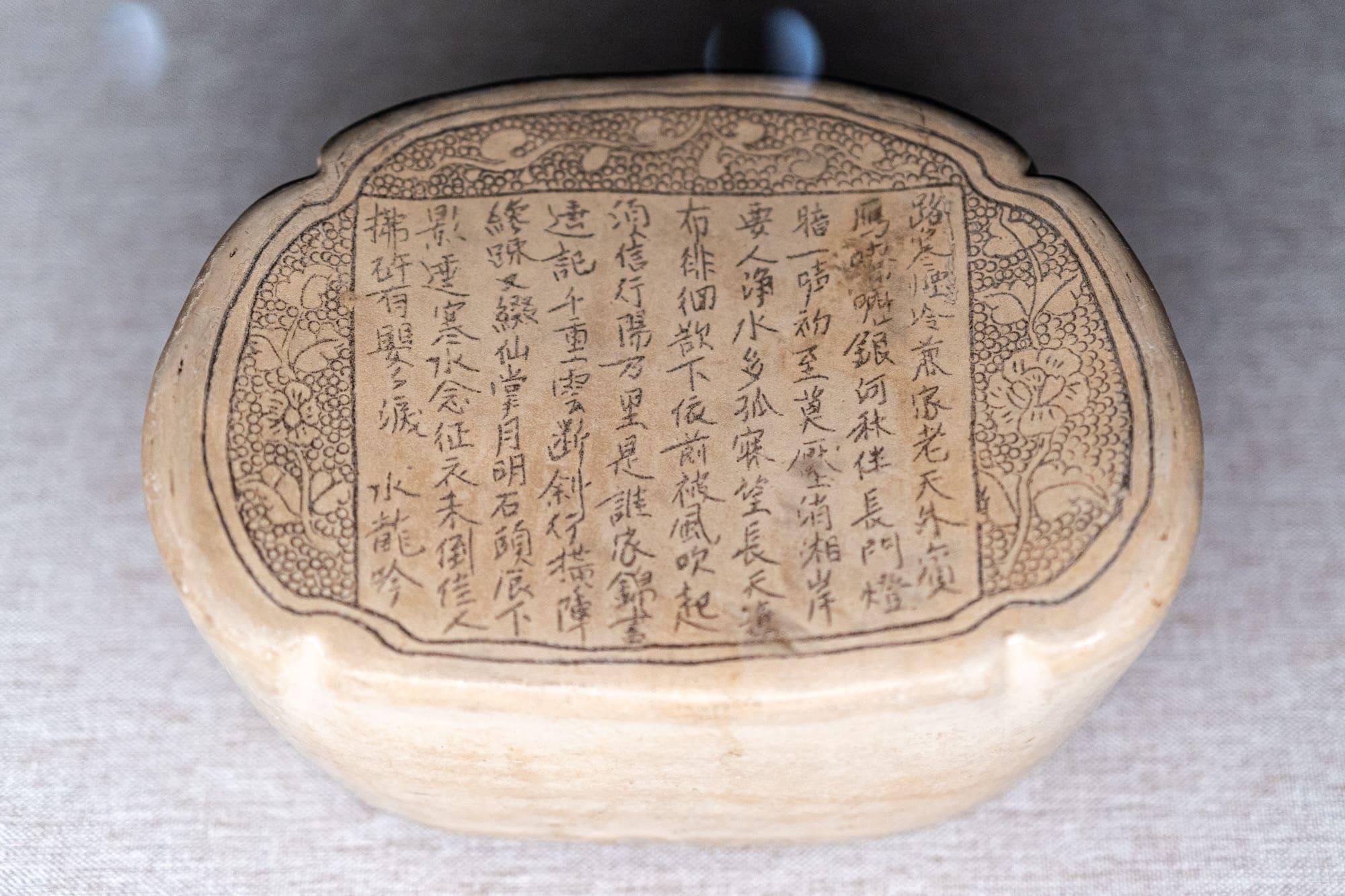 白釉珍珠地《水龙吟》瓷枕:宋代,三门峡出土。