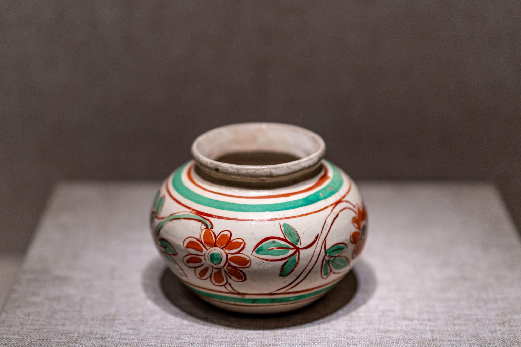 当阳峪窑白釉红绿彩缠枝花卉纹罐:金代,焦作出土。