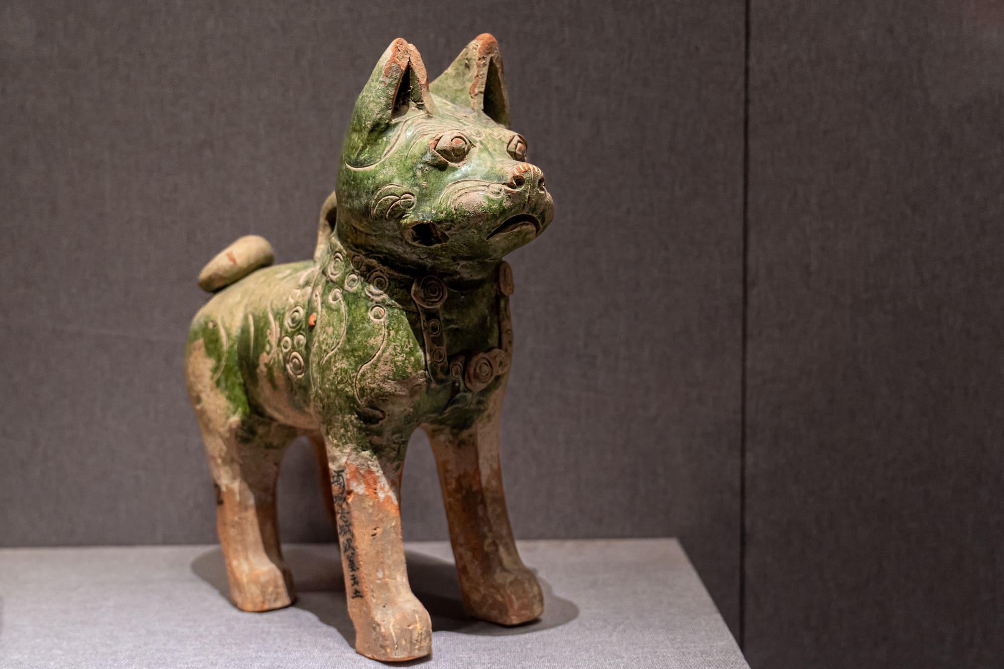 绿釉立姿陶狗:汉代,项城市出土。它的原型是四眼铁包金狗,是中华田园犬的一个品种。有人说它是日本柴犬的祖宗。
