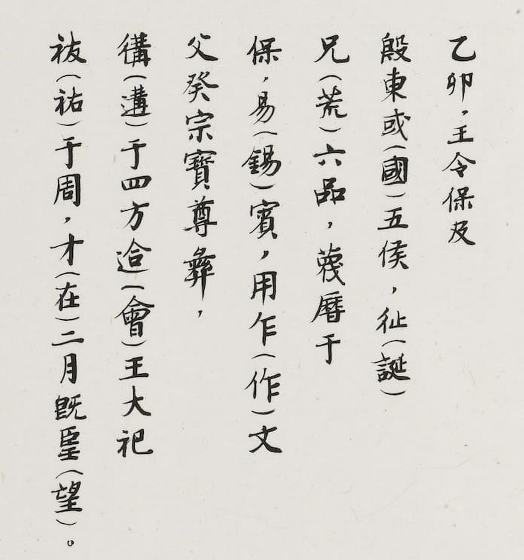 “乙卯,王令保及殷东国五侯,彳止(诞)兄(荒)六品,蔑历于保,赐宾,用作文父癸宗宝尊彝,遘于四方,䢔(会)王大祀祓(祐)于周,在二月既望。”