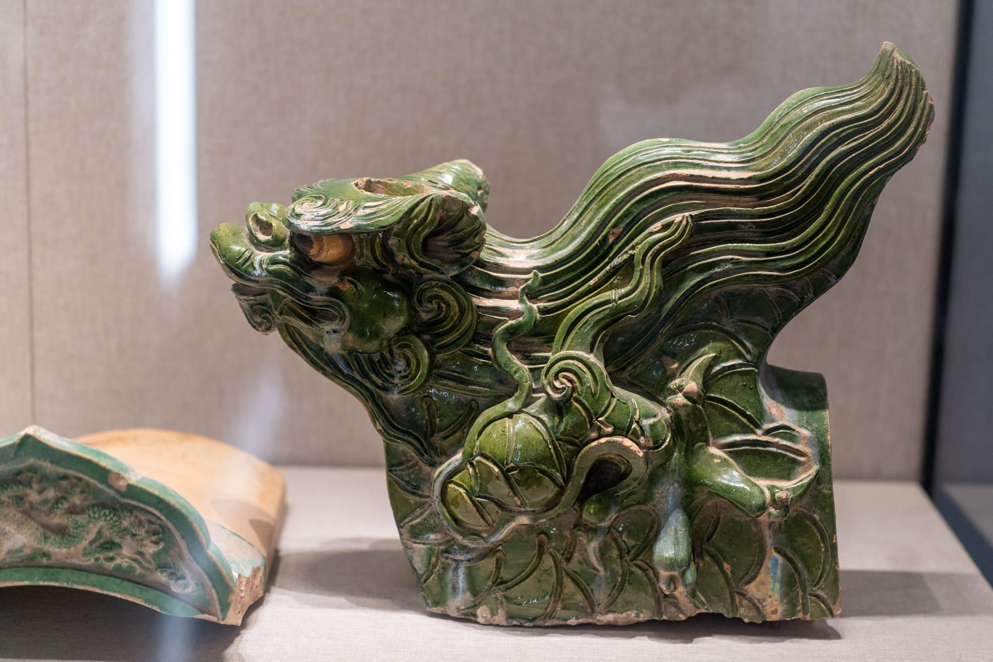 包括绿釉琉璃垂兽和龙纹瓦当。明代分封诸王于河南,这些琉璃构件色彩艳丽,造型威猛,显示了当时王府建筑的等级与奢华。