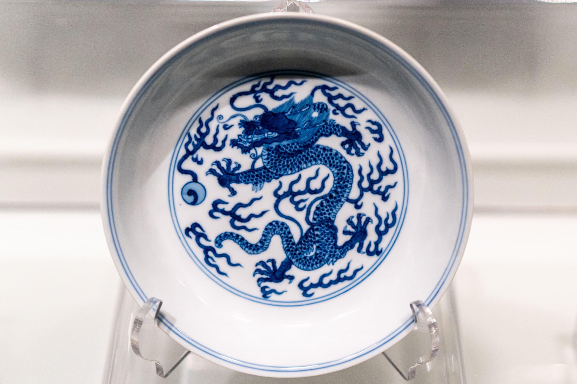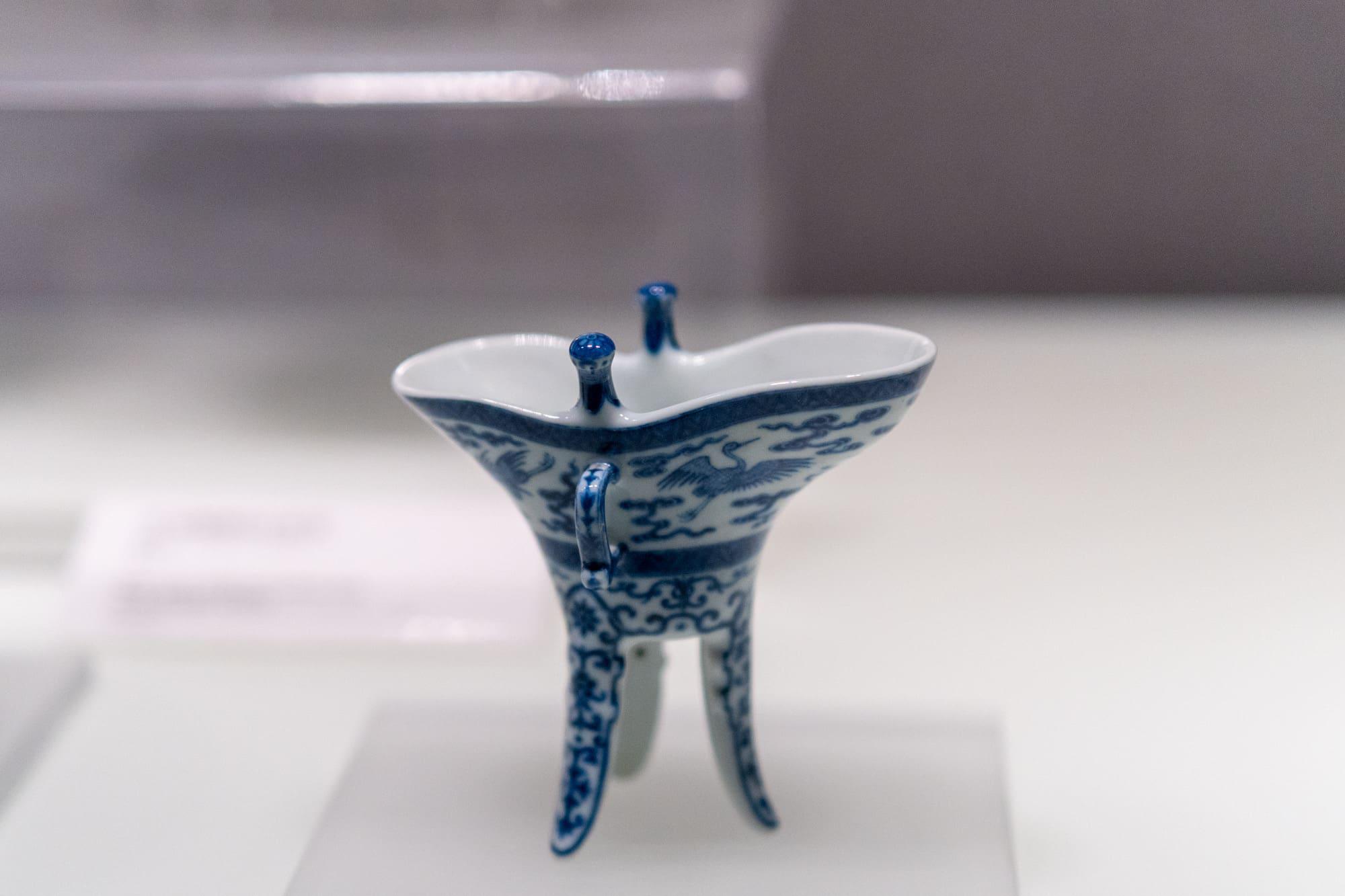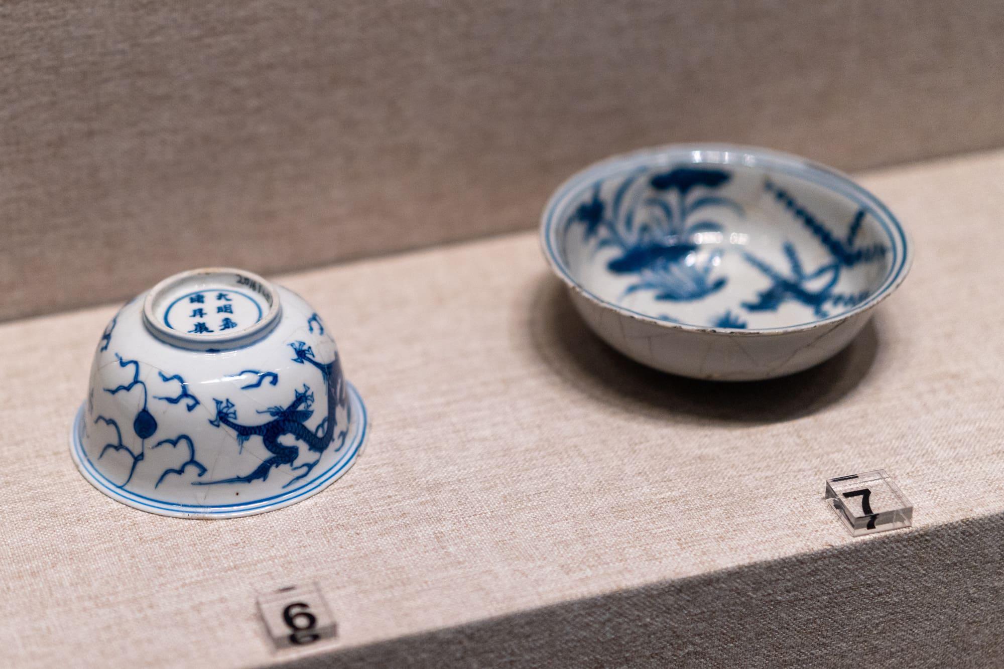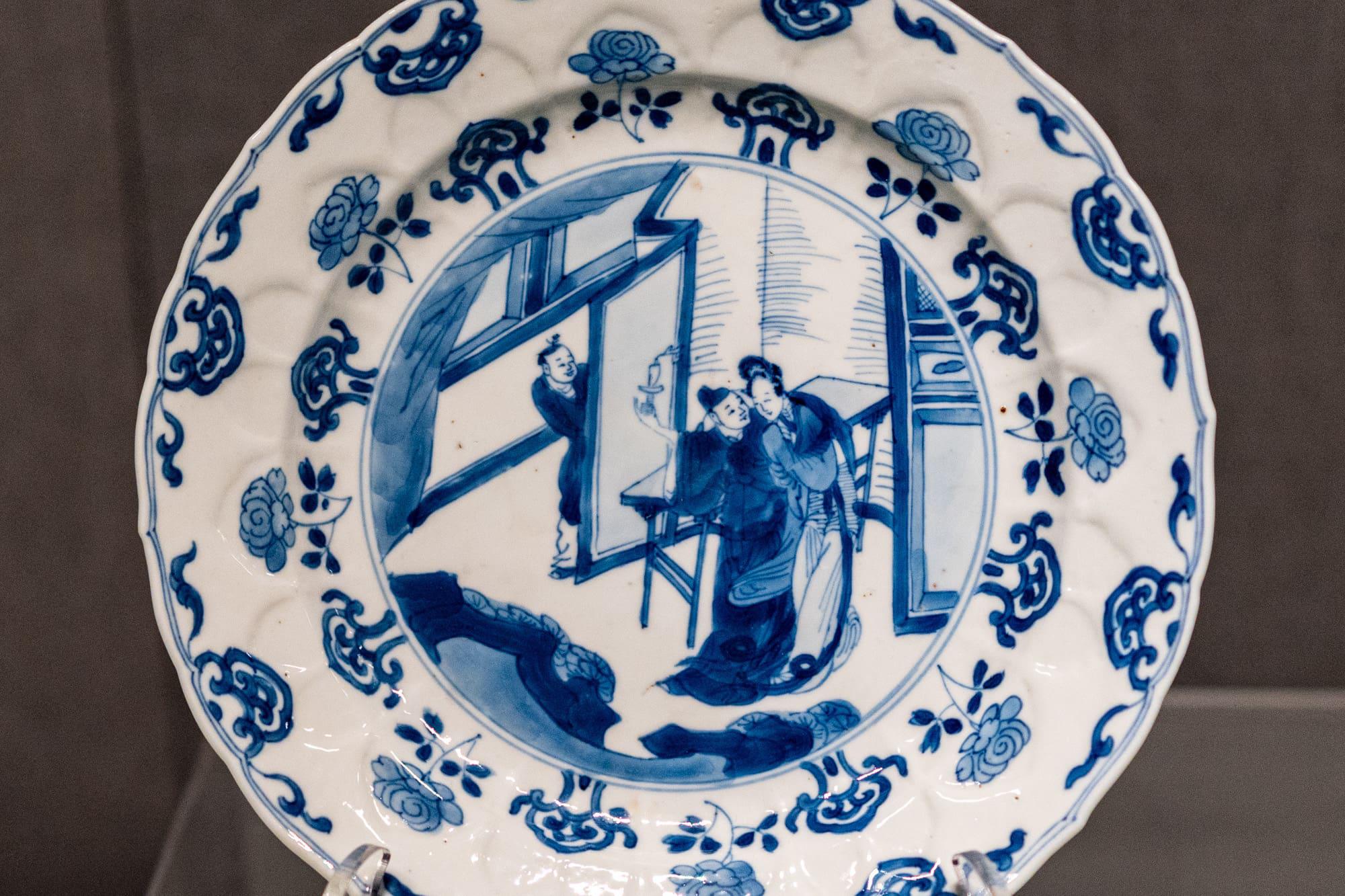 包括青花人物故事纹菱花瓷盘(康熙)、青花云龙纹瓷盘(乾隆)、青花云鹤纹瓷爵(乾隆)。