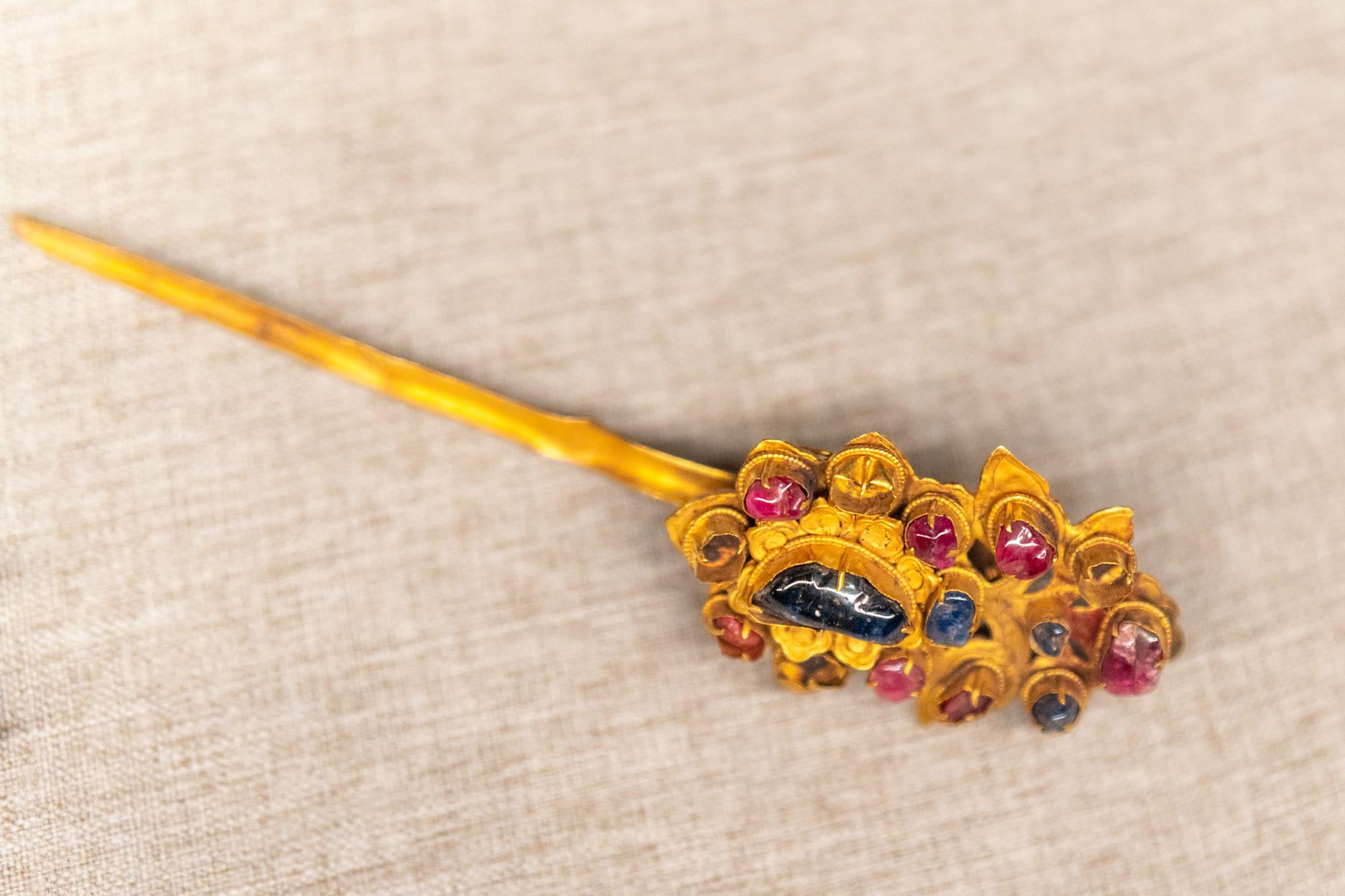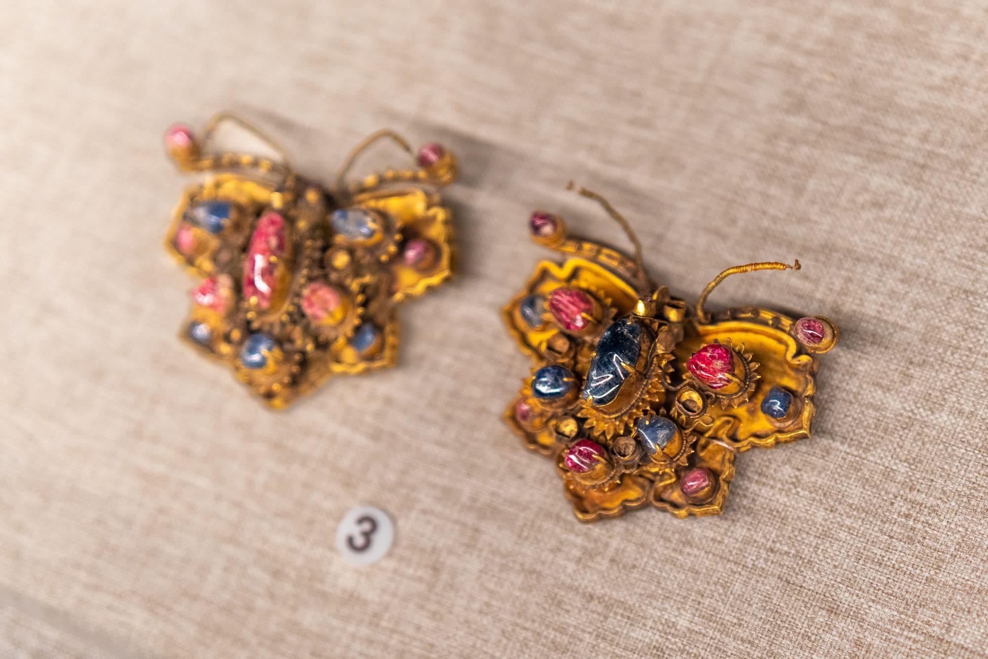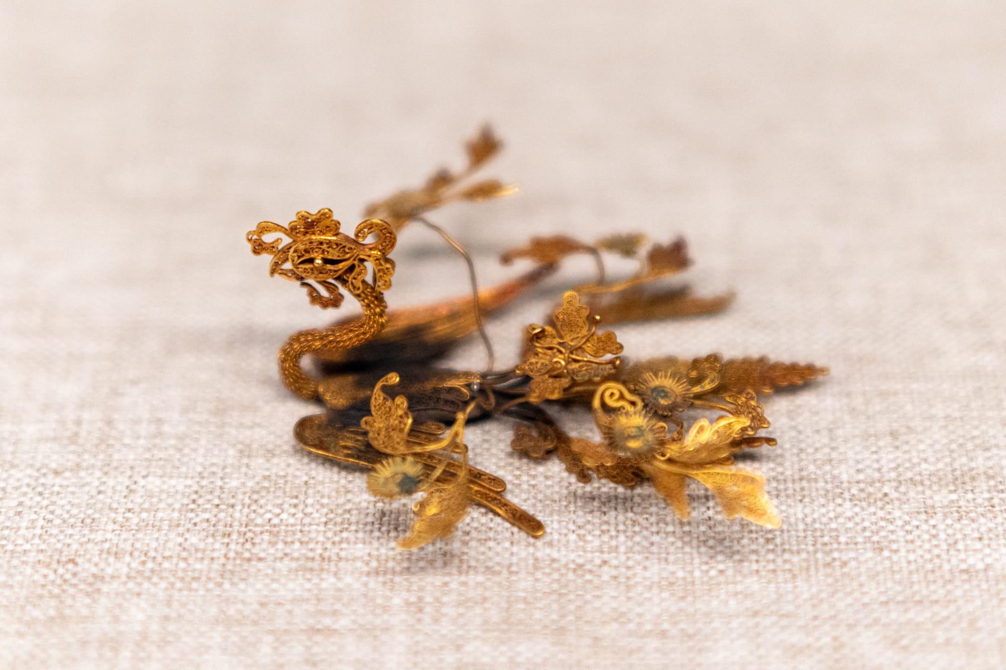 镶宝石金蝴蝶、凤凰金髻(jì)饰、云龙托镶宝石金簪,采用累丝、镶嵌等复杂工艺,造型精致,金光熠熠。
