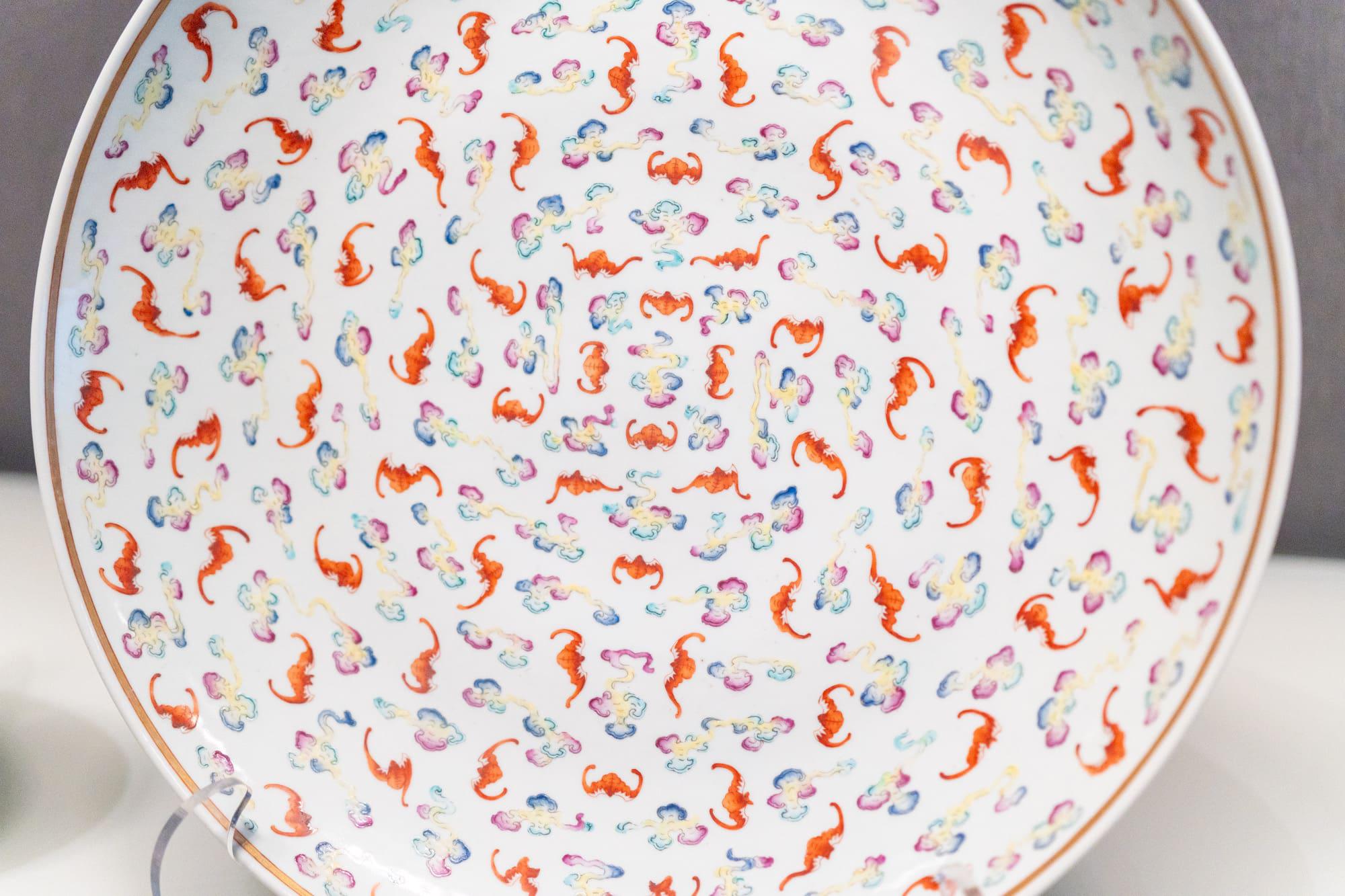粉彩云蝠纹瓷盘:清光绪。盘内及外缘绘有百只蝙蝠与祥云相间,利用“蝠”与“福”的谐音,寓意“洪福齐天”,是清代晚期官窑的典型吉祥纹样。