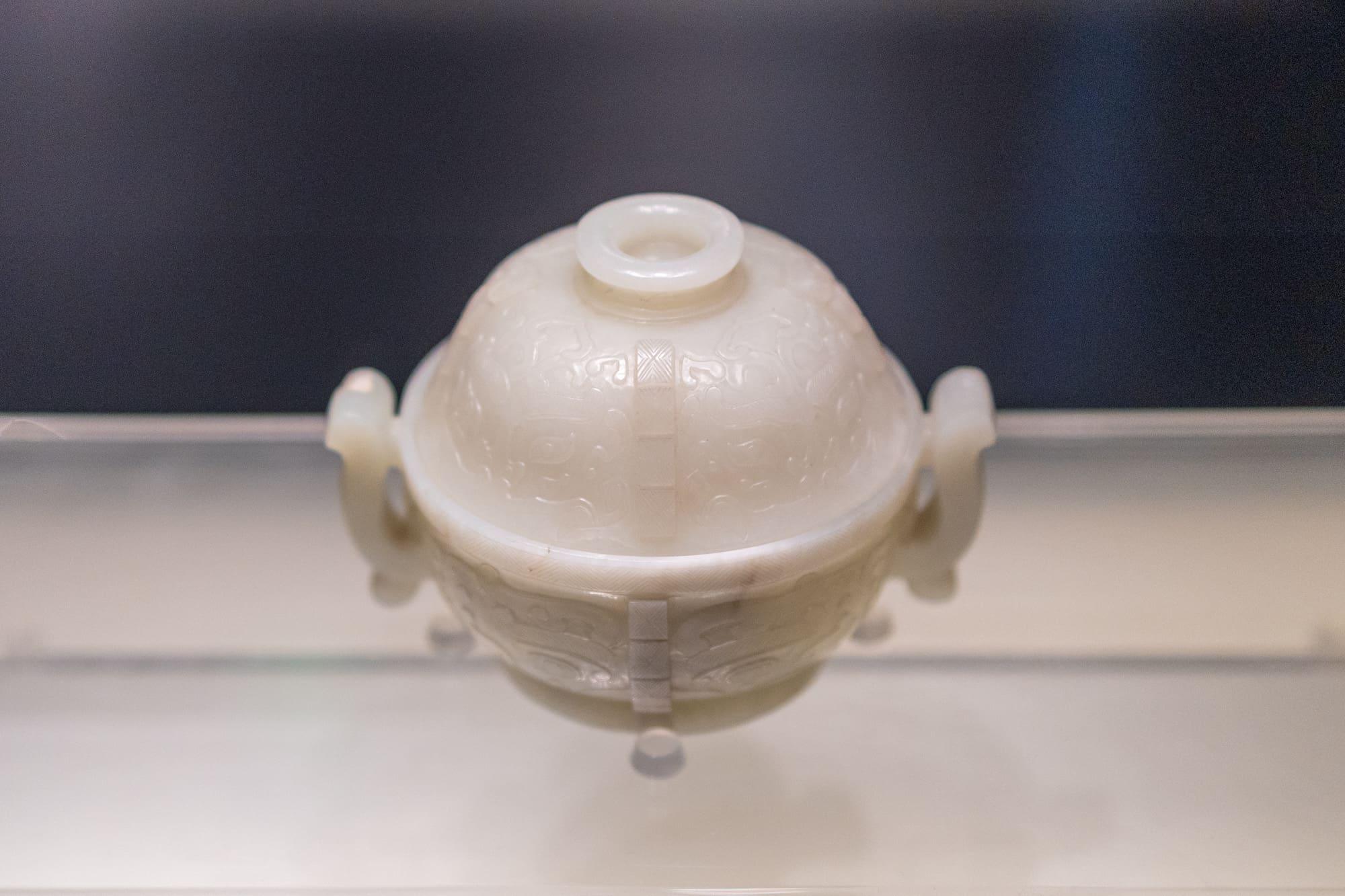 青玉兽面纹盖炉:清代。仿古青铜器造型,玉质温润,雕工精细,显示了清代玉雕“仿古”的审美风尚。