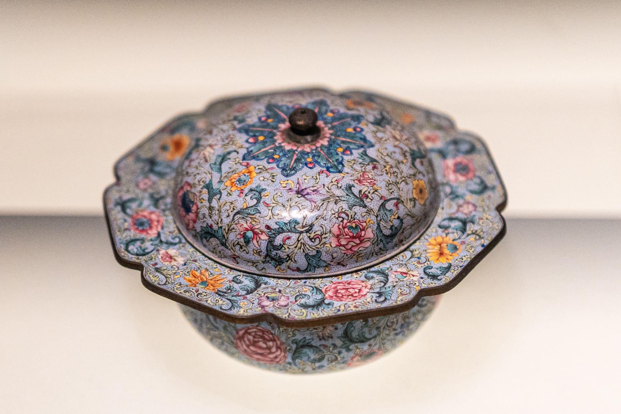 珐琅器在元代由西亚传入中国,经明宣德、景泰两朝的努力,工艺突飞猛进。其以金属为胎,施珐琅釉焙烧而成,因工艺技法不同可分为掐丝珐琅、錾胎珐琅、透明珐琅和画珐琅数种。器物色调鲜艳,格调秀雅。