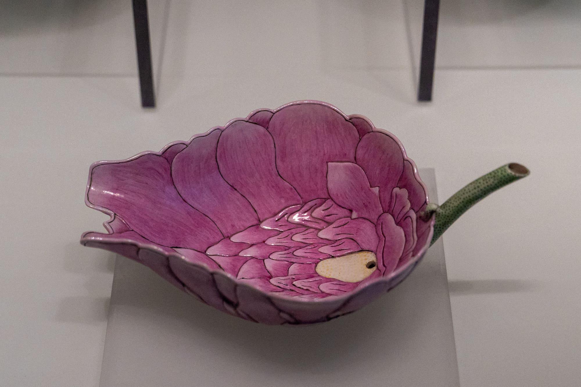粉彩荷花瓷吸杯:清光绪三十四年(1908 年)。杯荷梗上竖写墨字楷书:“大清光绪三十四年安徽太湖附近秋操记念杯”。“秋操”是光绪年间进行的大型秋季军事操练,此杯是中国晚清秋操活动的实物见证。