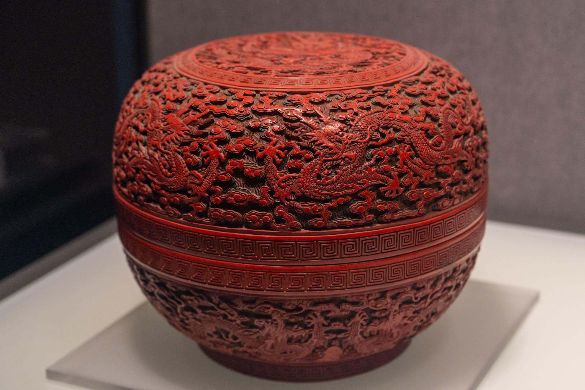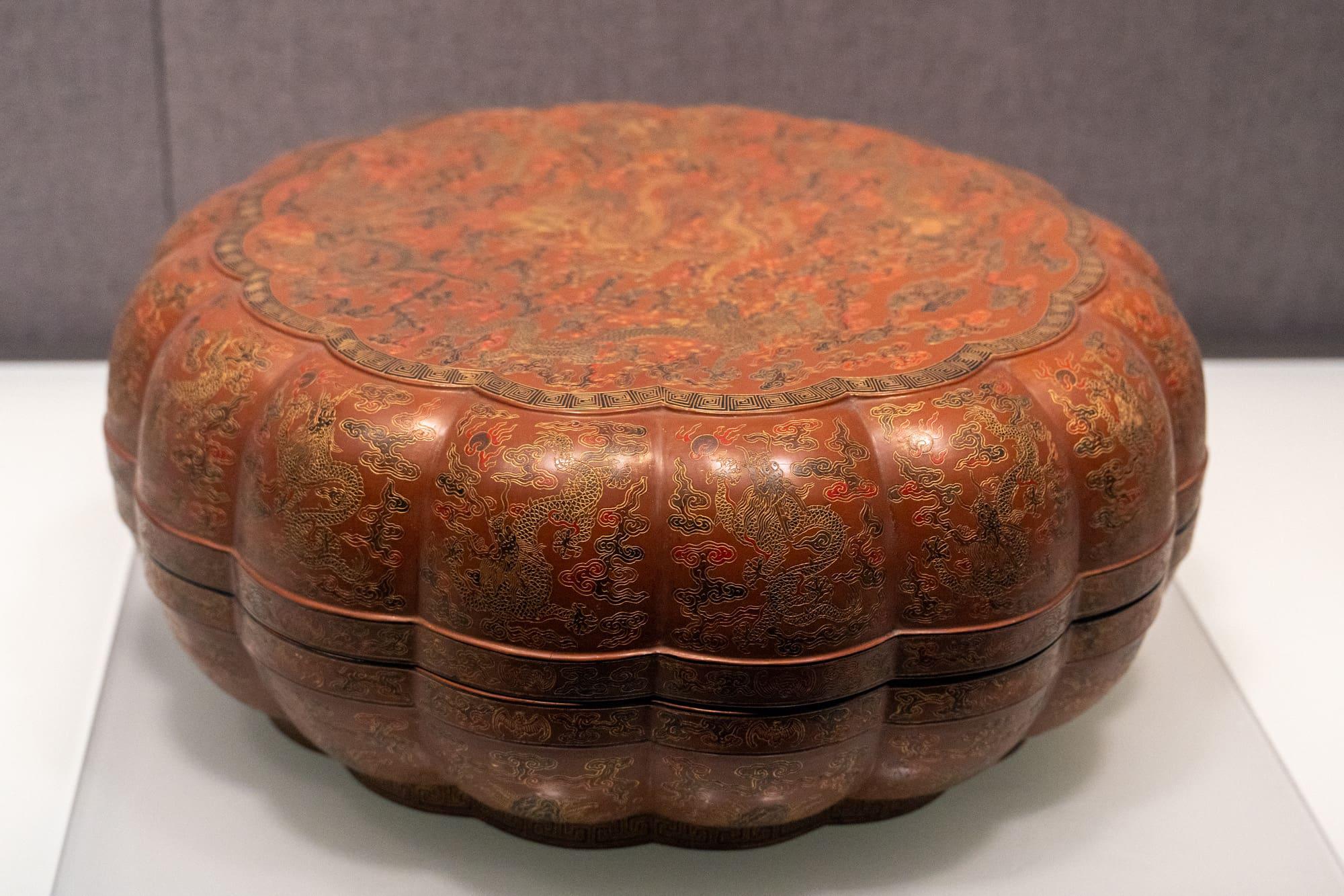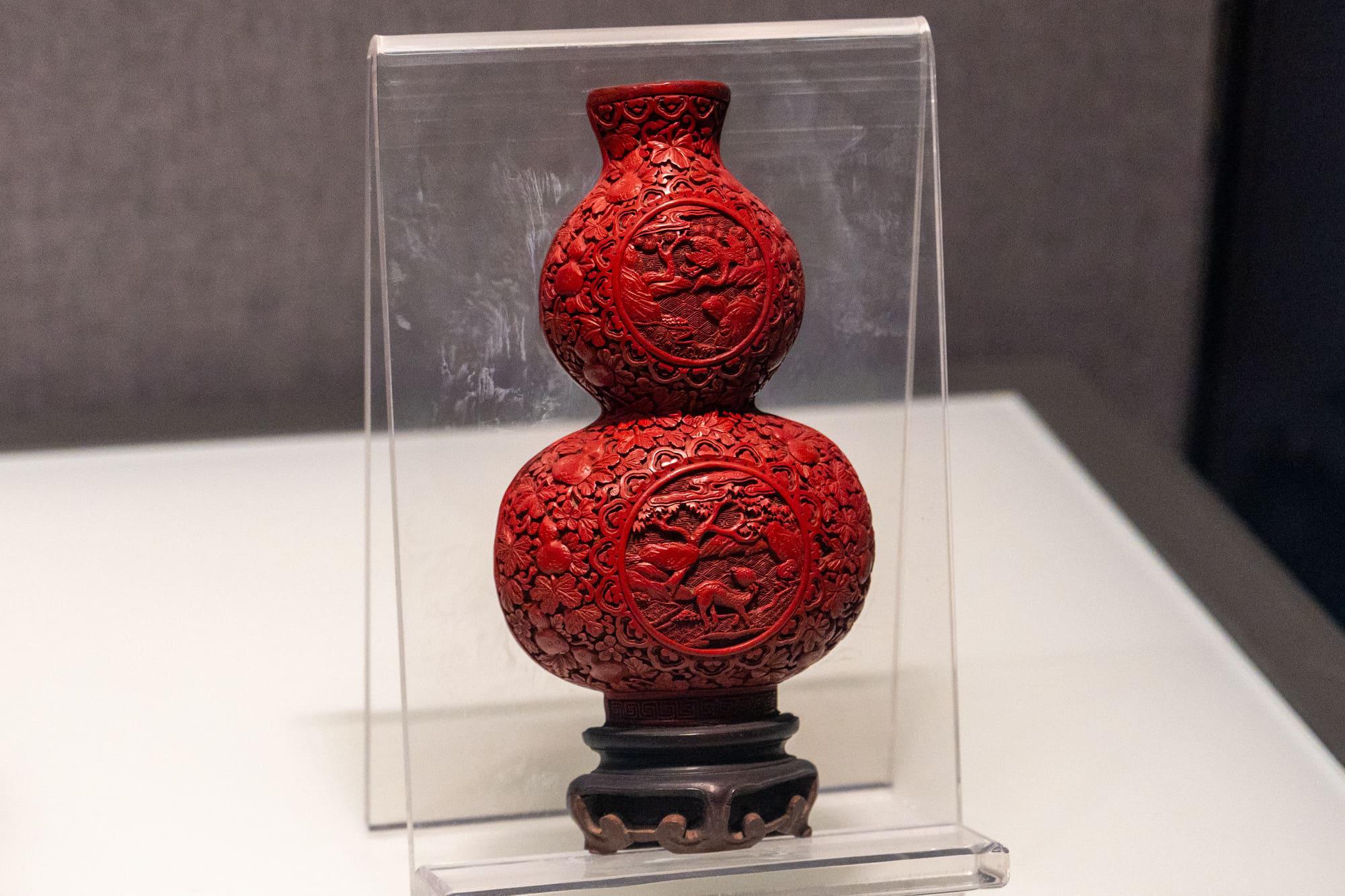 雕漆云龙戏珠圆盒、剔红葫芦形壁瓶:清代(1644 - 1911 年),征集。