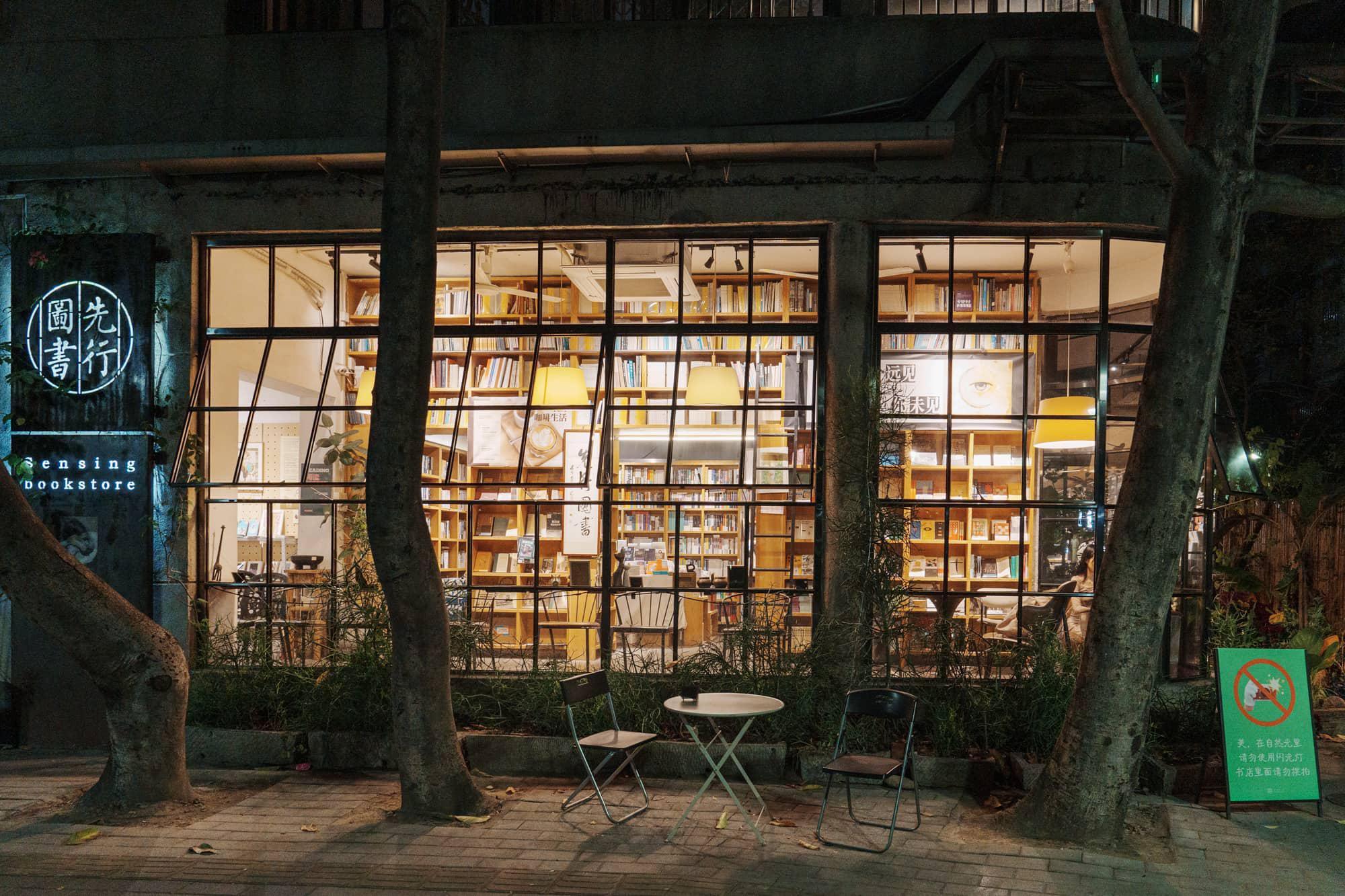 拍完花灯,继续独自骑车前往垂虹路的“先行图书”。这家书店也是网友推荐的网红打卡地,因为临近打烊我没有进去,只在外围留下了它的夜景影像,白天也好看,但这次没有机会去拍。