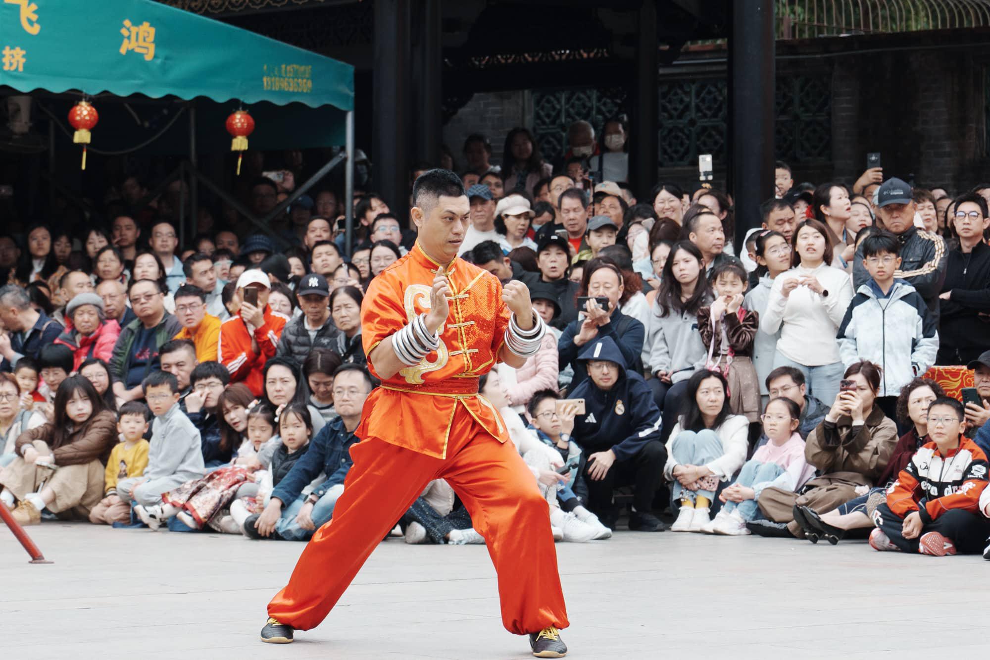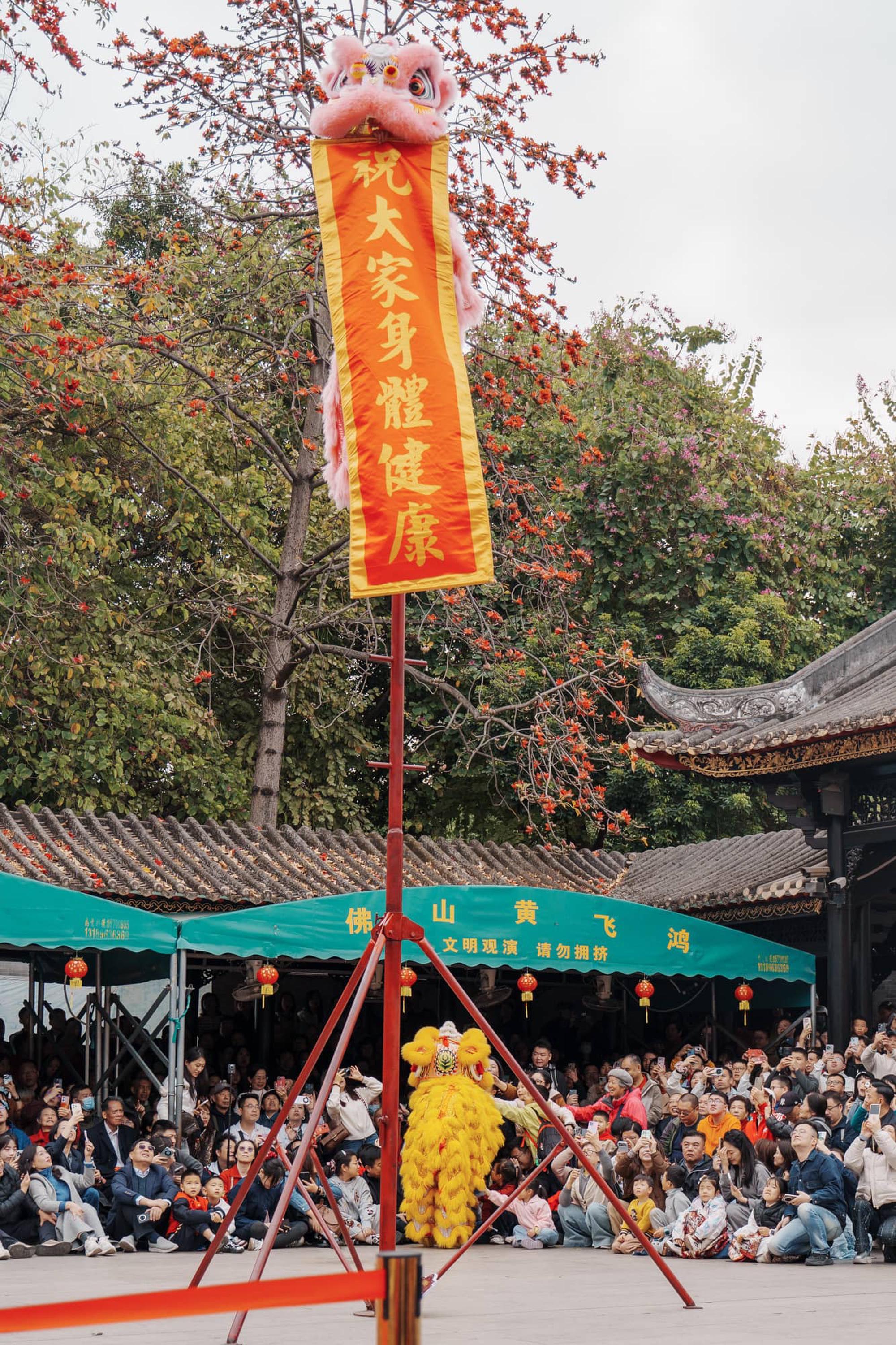 佛山醒狮:俗话说“天下醒狮,皆出佛山”。作为南狮的发源地,佛山的醒狮结合了武术的功底,狮子不仅要展现喜、怒、哀、乐等神态,还要在几米高的梅花桩上完成闪腾挪跃,极具观赏性和惊险感。