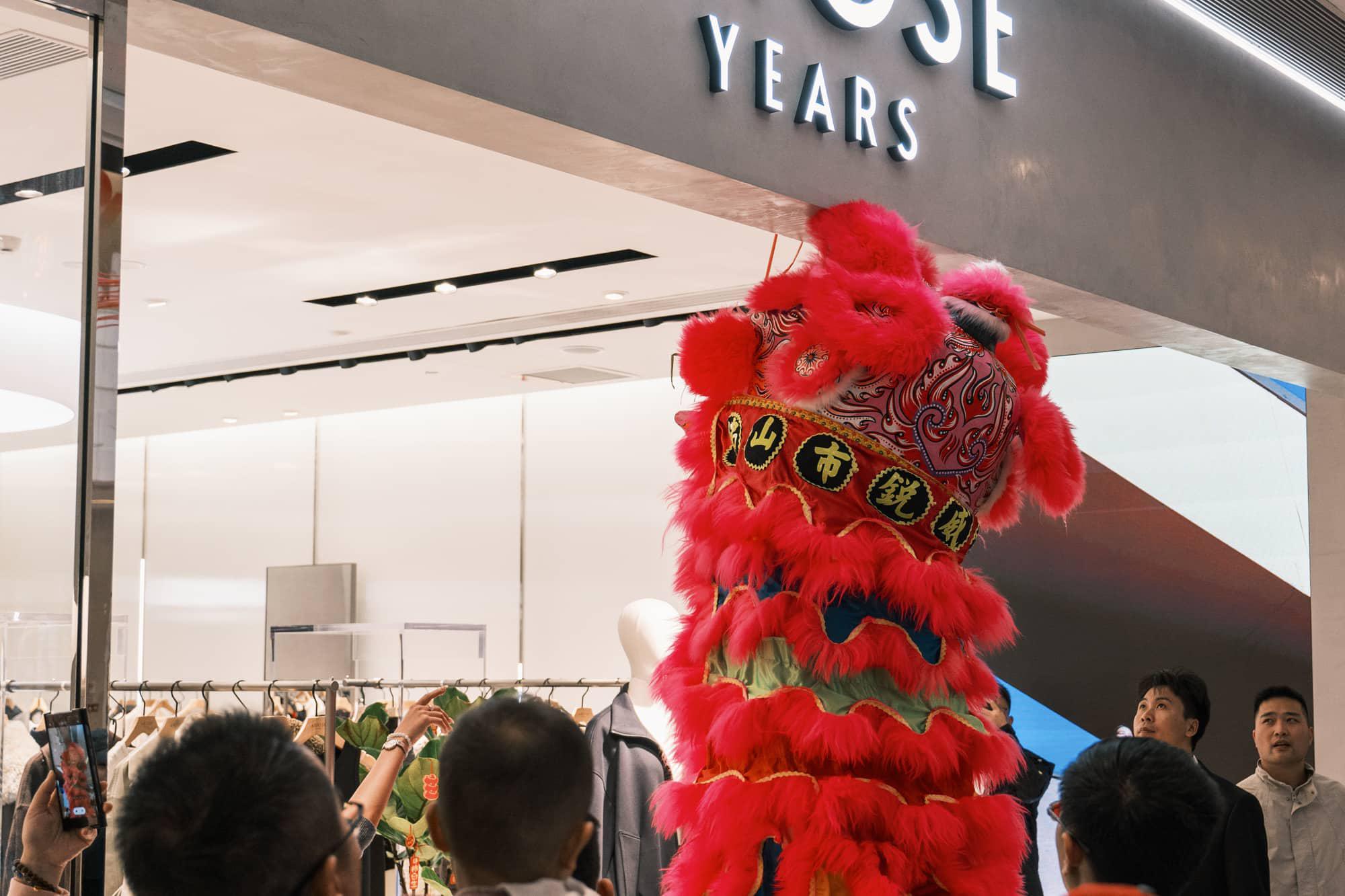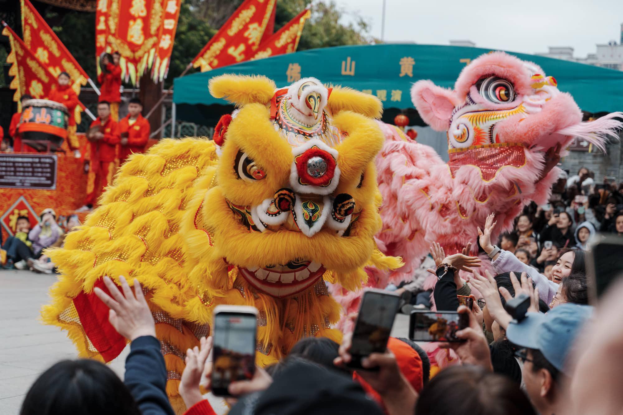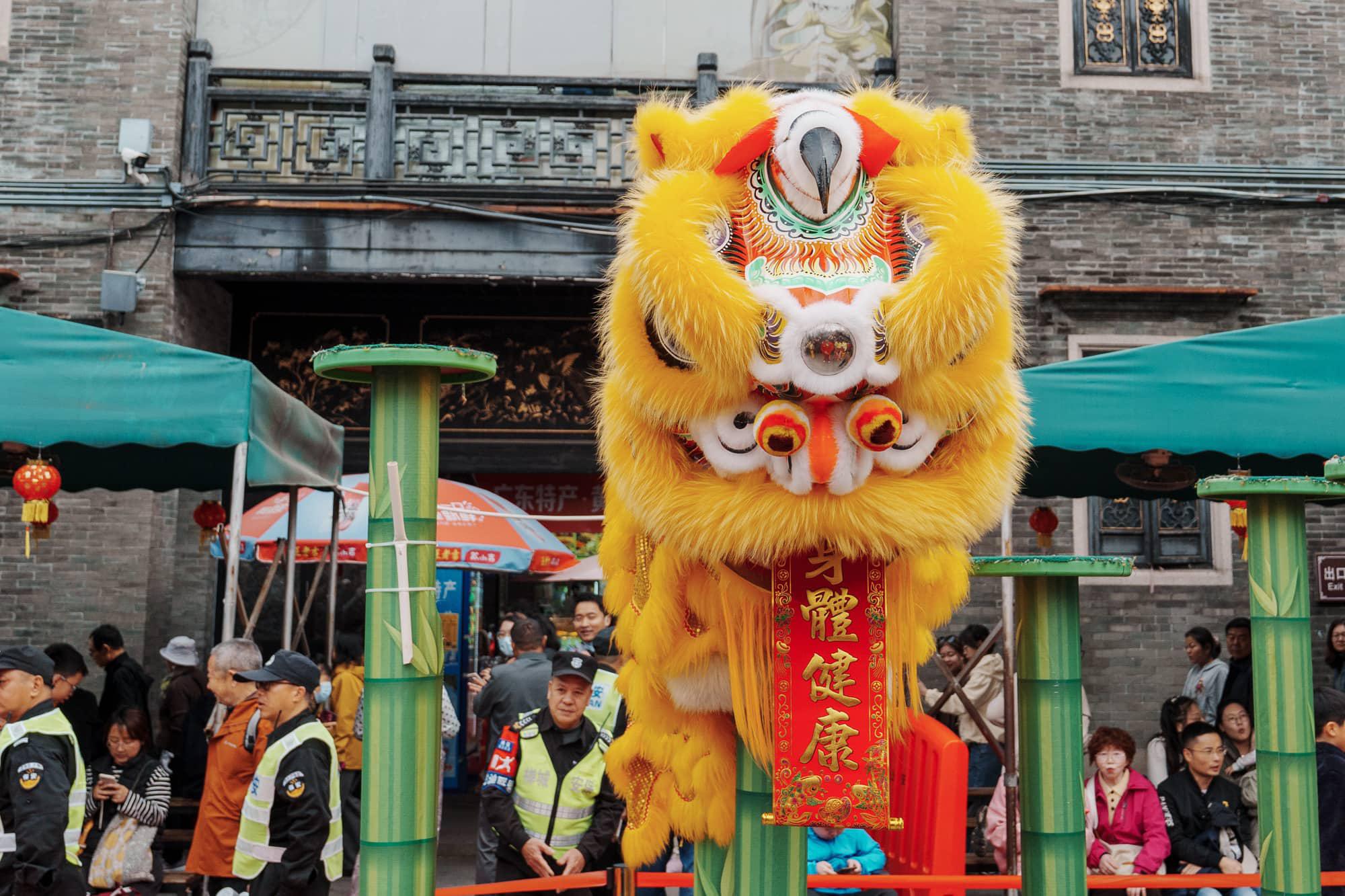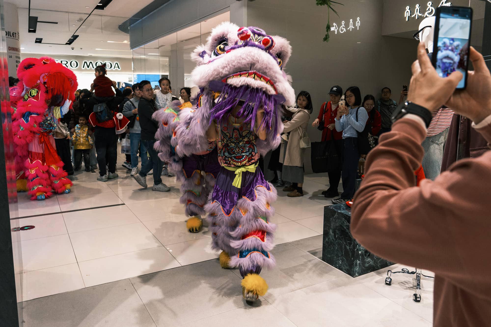 在广东,大年初一商场请醒狮表演是常规操作。这叫“瑞狮拜门”。狮子会进行“采青”仪式——通常是把生菜(谐音“生财”)挂在高处,狮子跃起一口“吃”掉,再把咬碎的生菜吐出来,寓意把财气和福气散播给商家和观众。