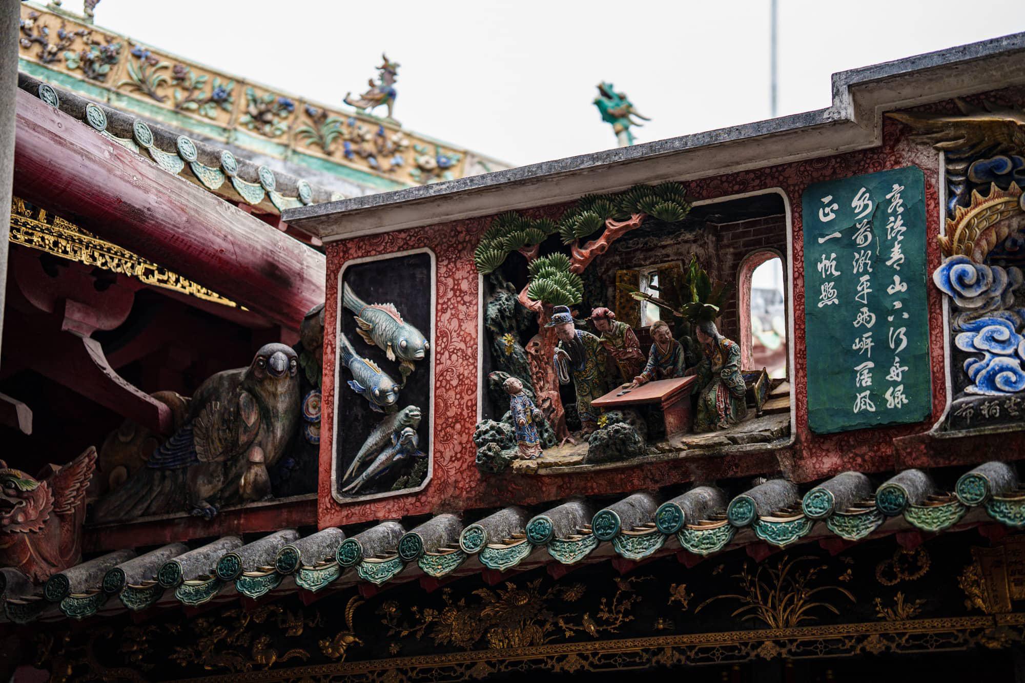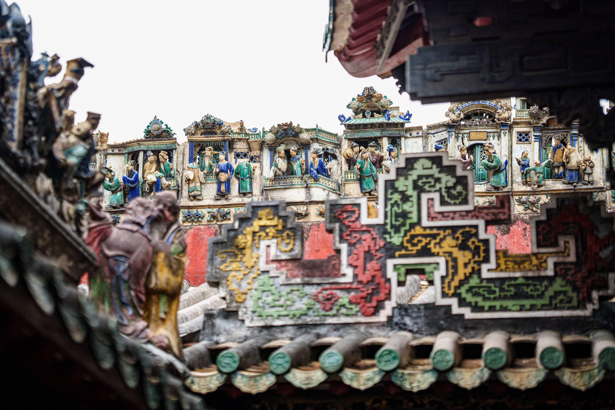 屋脊以石湾陶塑(瓦脊公仔)装饰,四周墙壁镶有大量砖雕、灰雕。